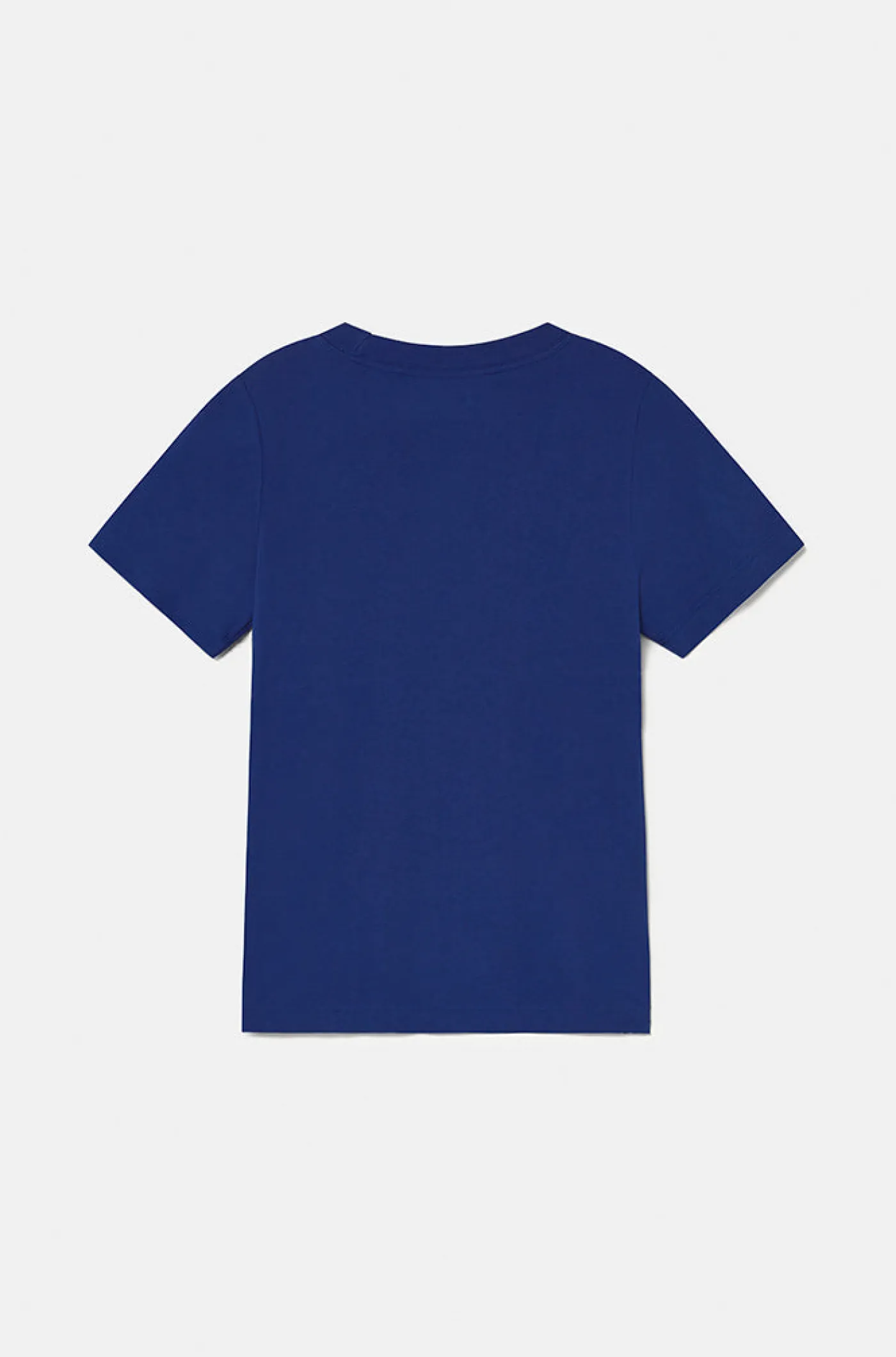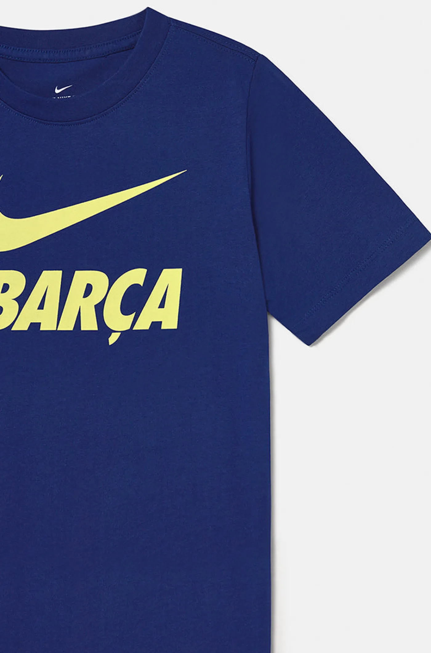 Camiseta para niño de manga corta con rotulación de “Barça” y el logo de Nike centrados en el pecho. Detalle de escudo del FC Barcelona en la parte inferior de la cintura. Cuello redondo. Su tejido de algodón la convierte en una prenda cómoda y ligera. Color: Azul eléctrico