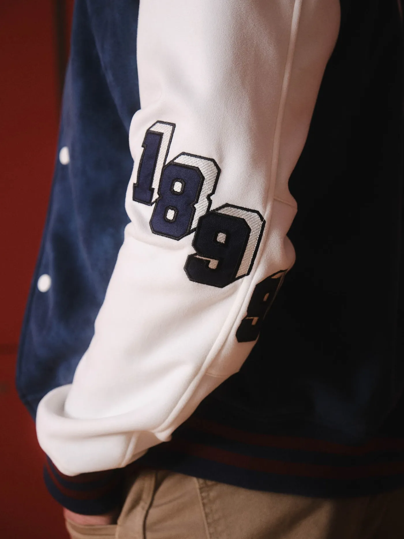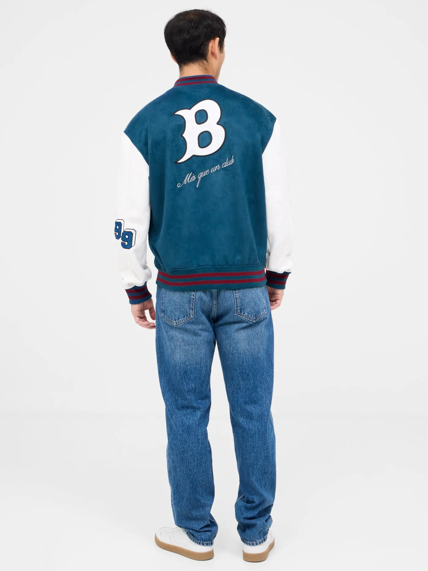 Chaqueta bomber con cuerpo azul y mangas blancas con detalle blaugrana en ambos puños.