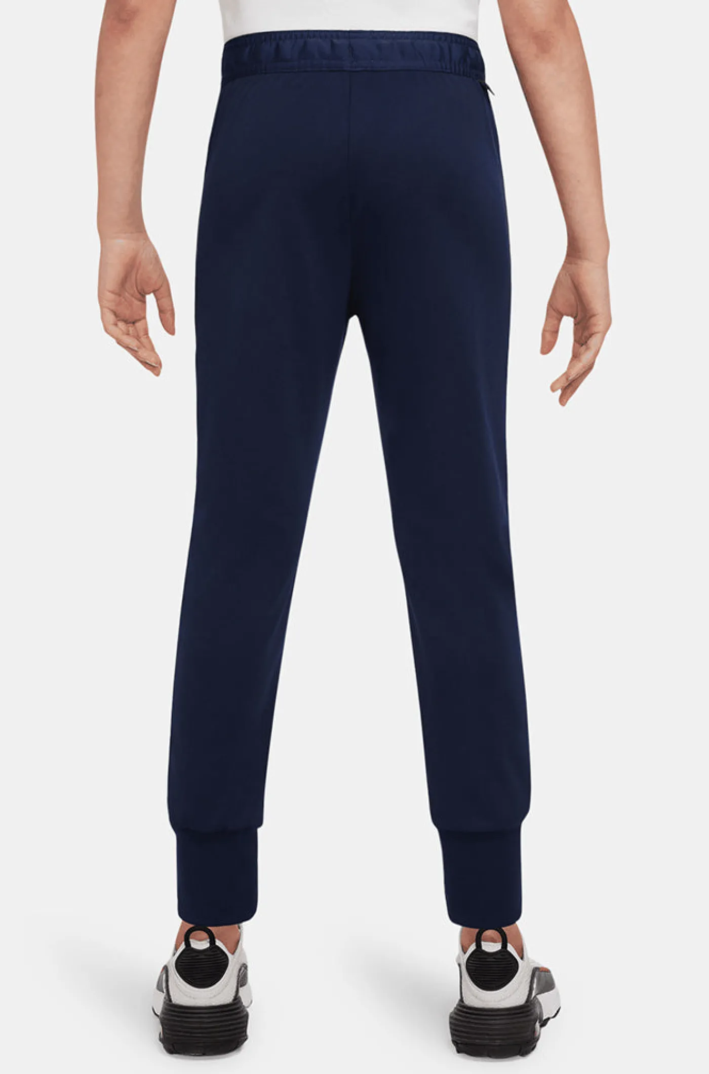 Pantalón largo para niños/as de 6 a 14 años como los que utilizan los jugadores para los desplazamientos. Cintura elástica con cordones. Bolsillos delanteros: 2. Bajo con acabado en canalé. Color: azul marino.