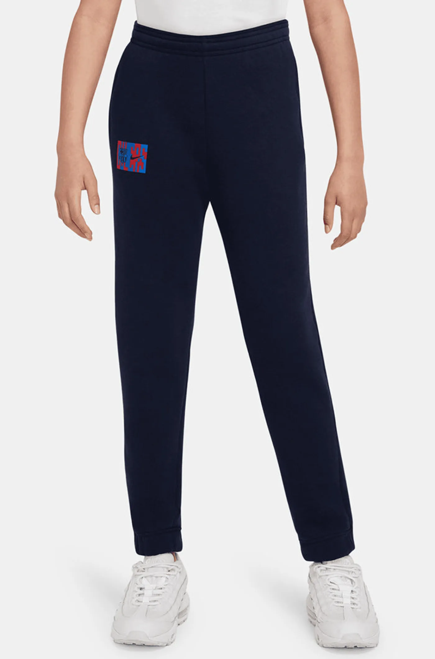 Pantalón deportivo para niños/as de 6 a 14 años con el parche del escudo de FC Barcelona y el logo de Nike bordado a contraste. Cintura elástica con cordones. Bolsillos delanteros: 2. Bajo con acabado en canalé. Color: azul marino.