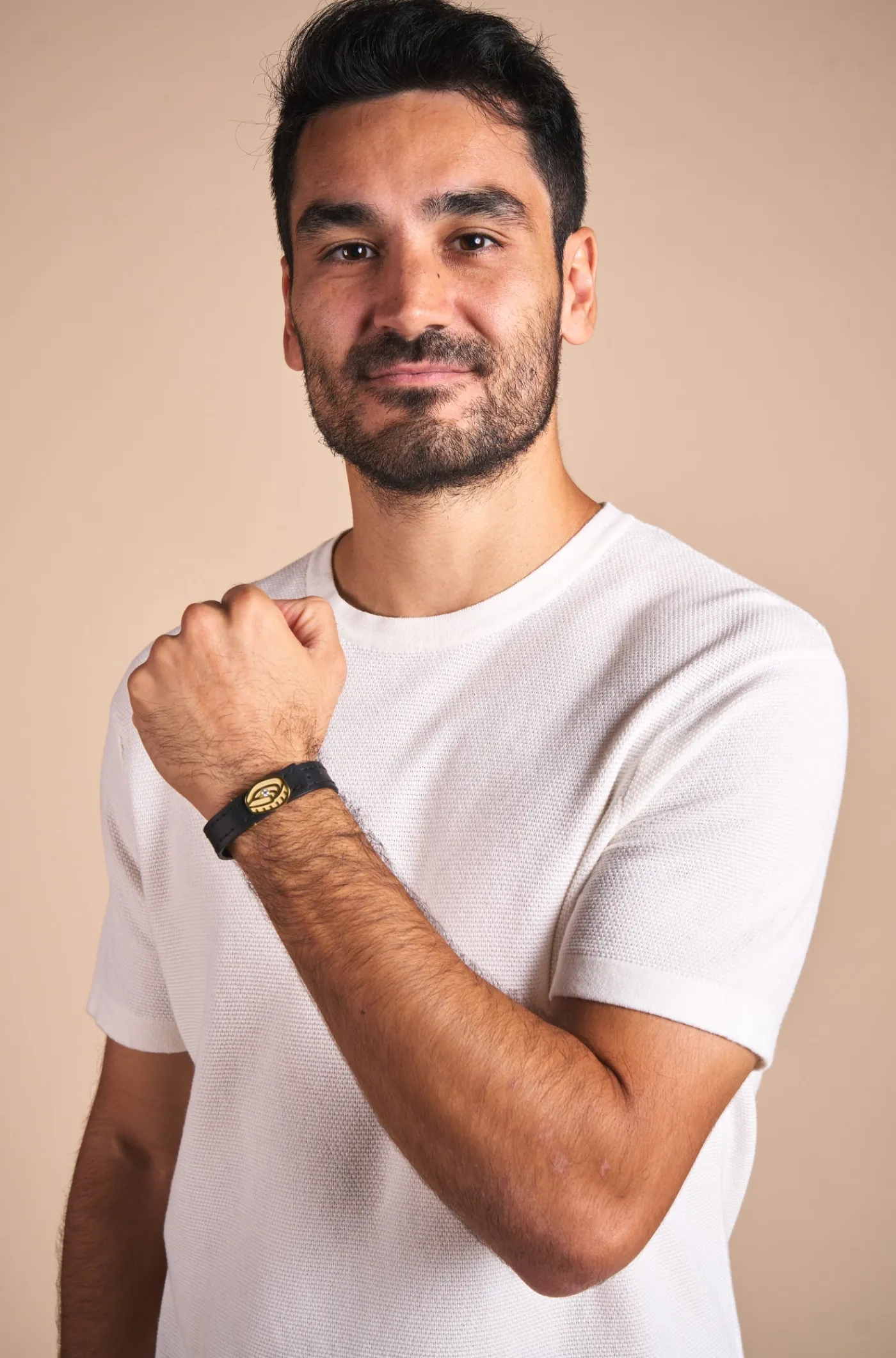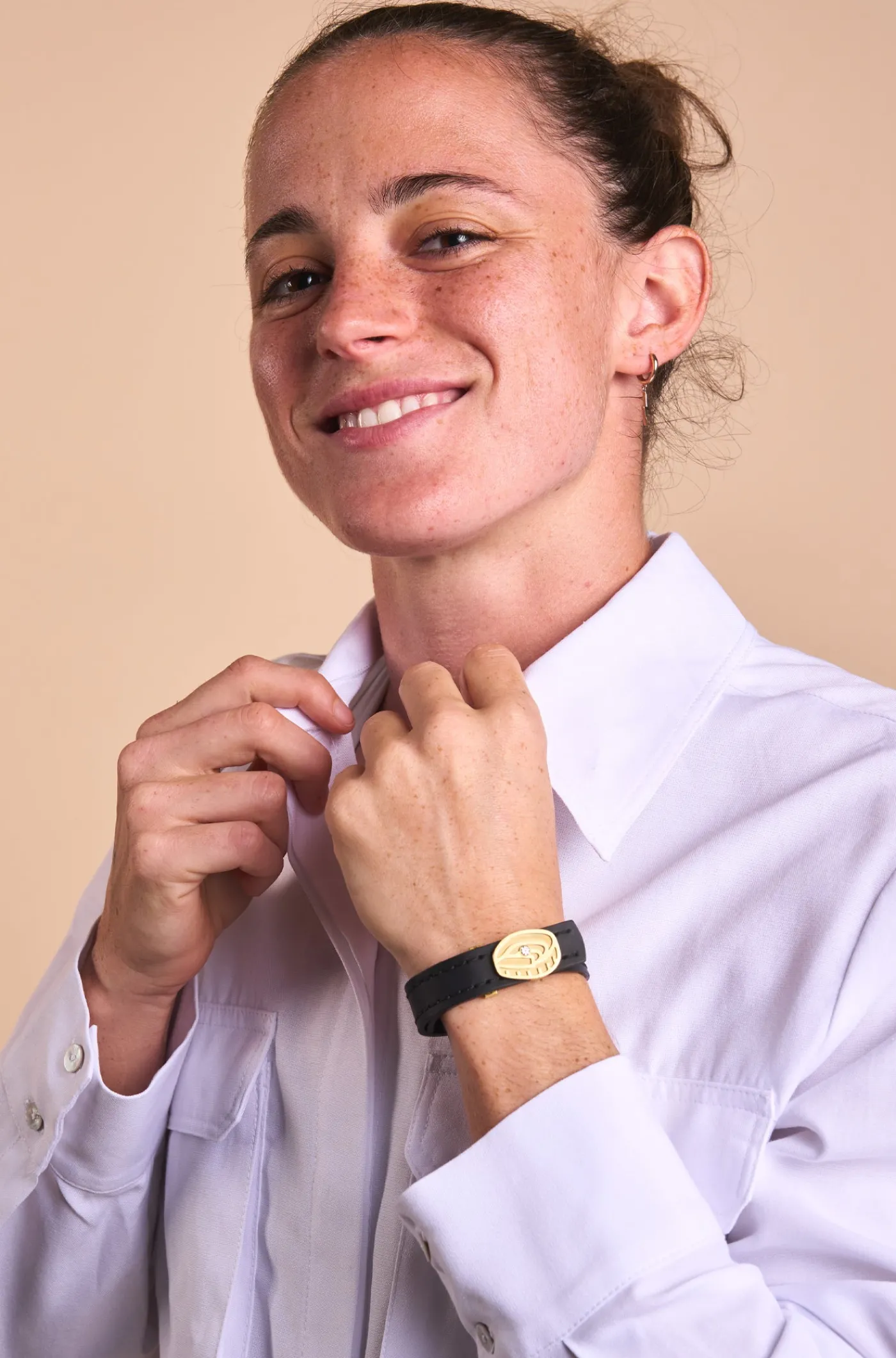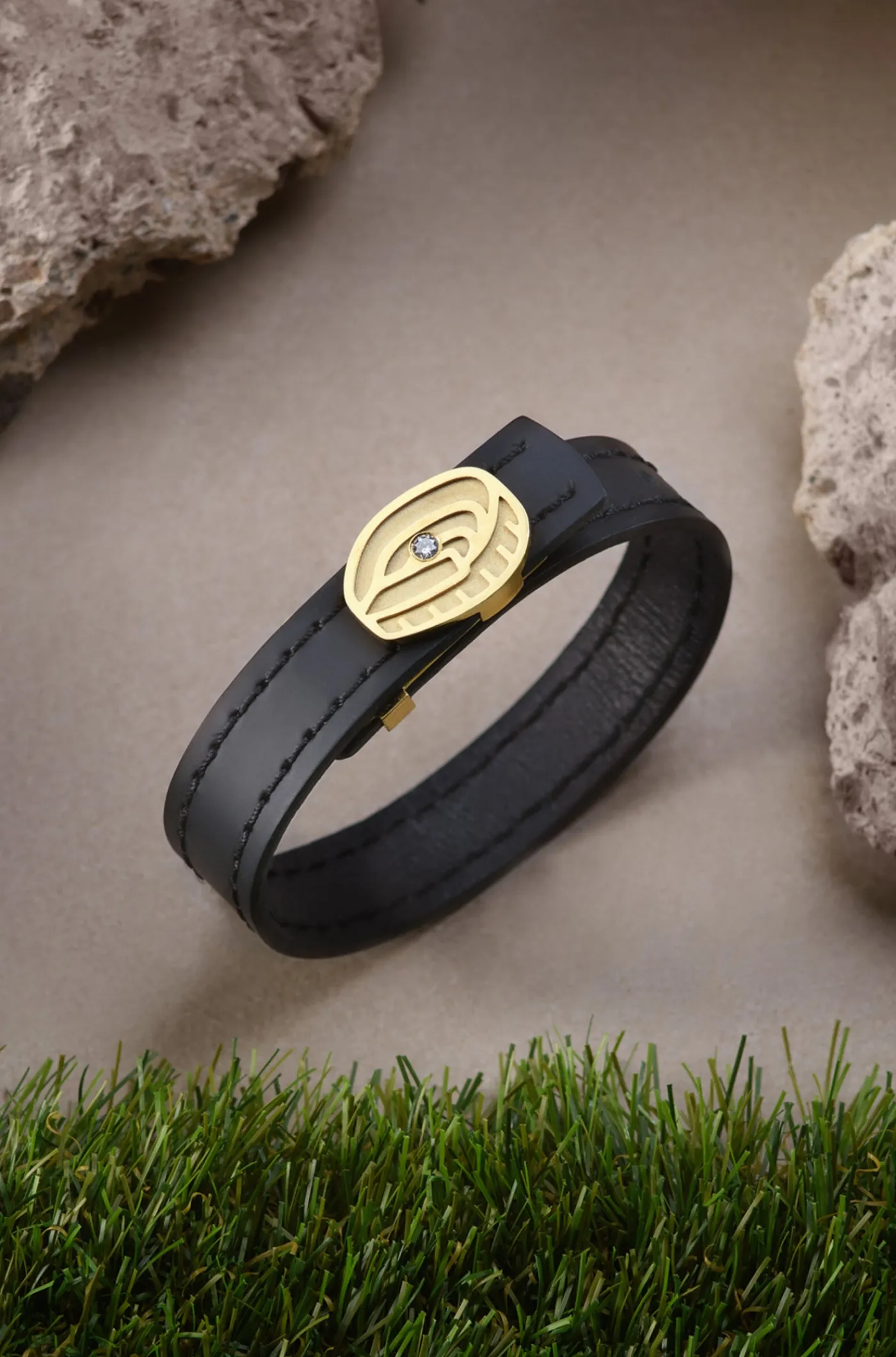 - Pulsera de cuero genuino pintado y estampado artesanalmente en exclusiva para esta colección, en elegante color negro y con ajuste regulable.