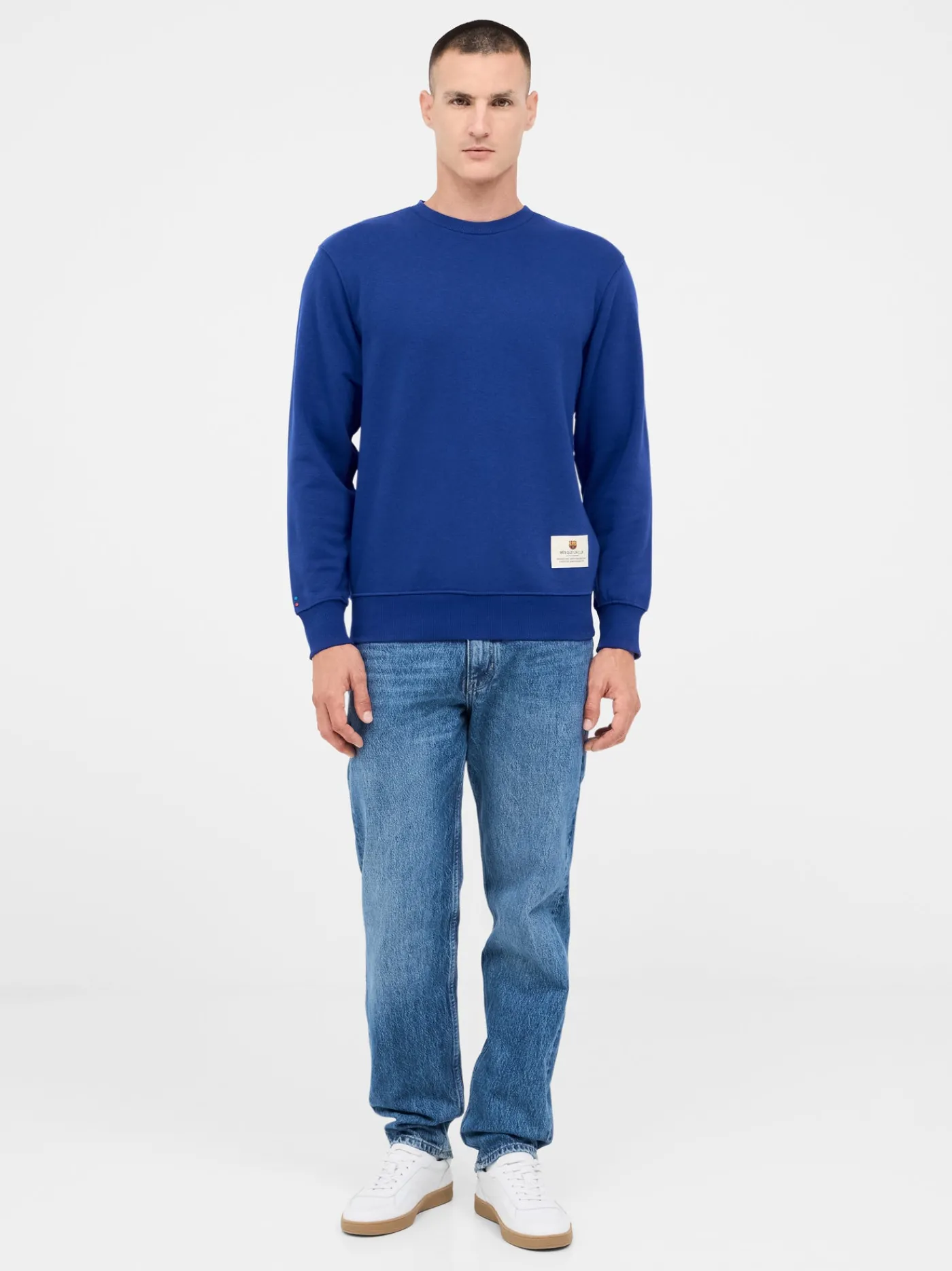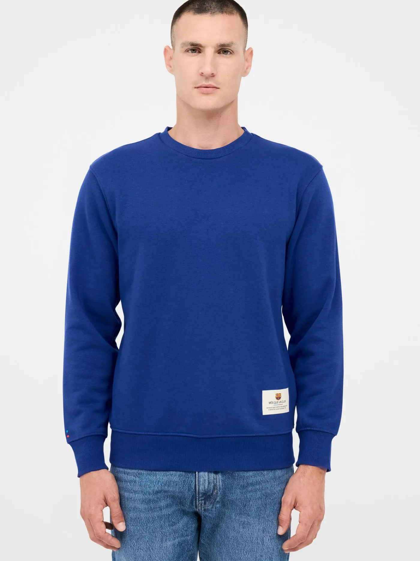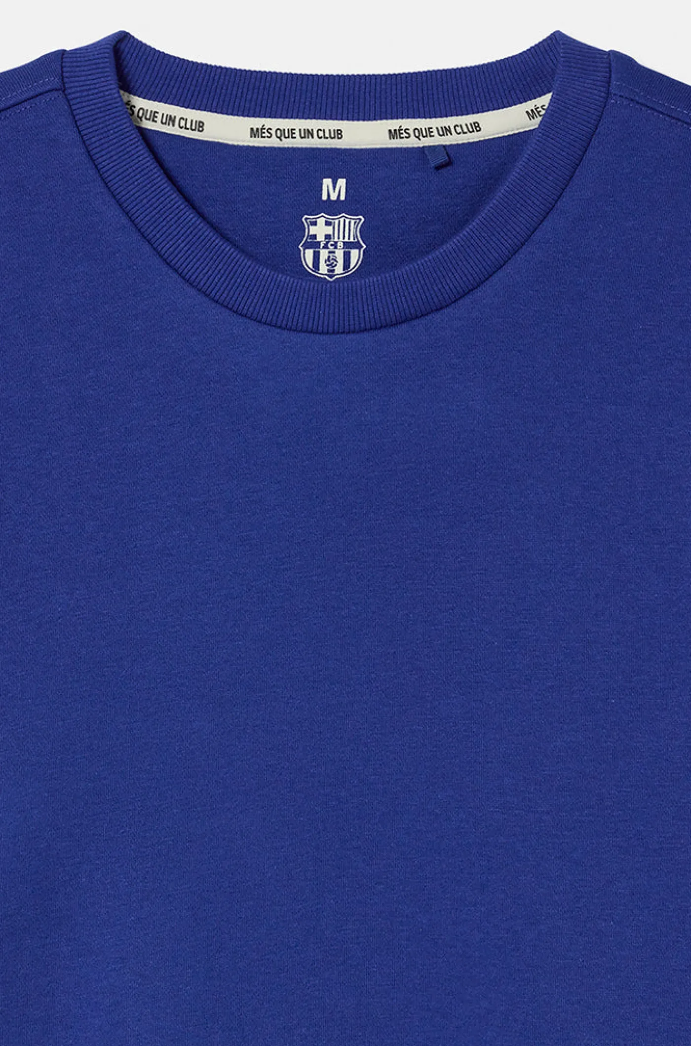 Sudadera con cuello redondo y manga larga, con parche con escudo pequeño del equipo FC Barcelona y las palabras “Més que un club” en el bajo. Con puños y bajo elásticos. Acabado ligero y suave en el interior. Color: azul royal.
