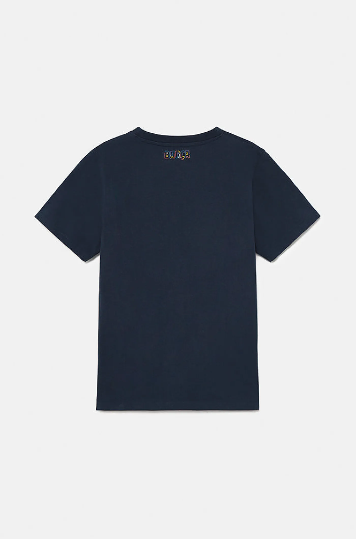 Camiseta júnior de manga corta con el escudo del FC Barcelona multicolor, mismo detalle del escudo en la parte de atrás del cuello utilizando la misma técnica. Su tejido de algodón la hace una prenda cómoda y ligera. Cuello redondo. Color: marino
