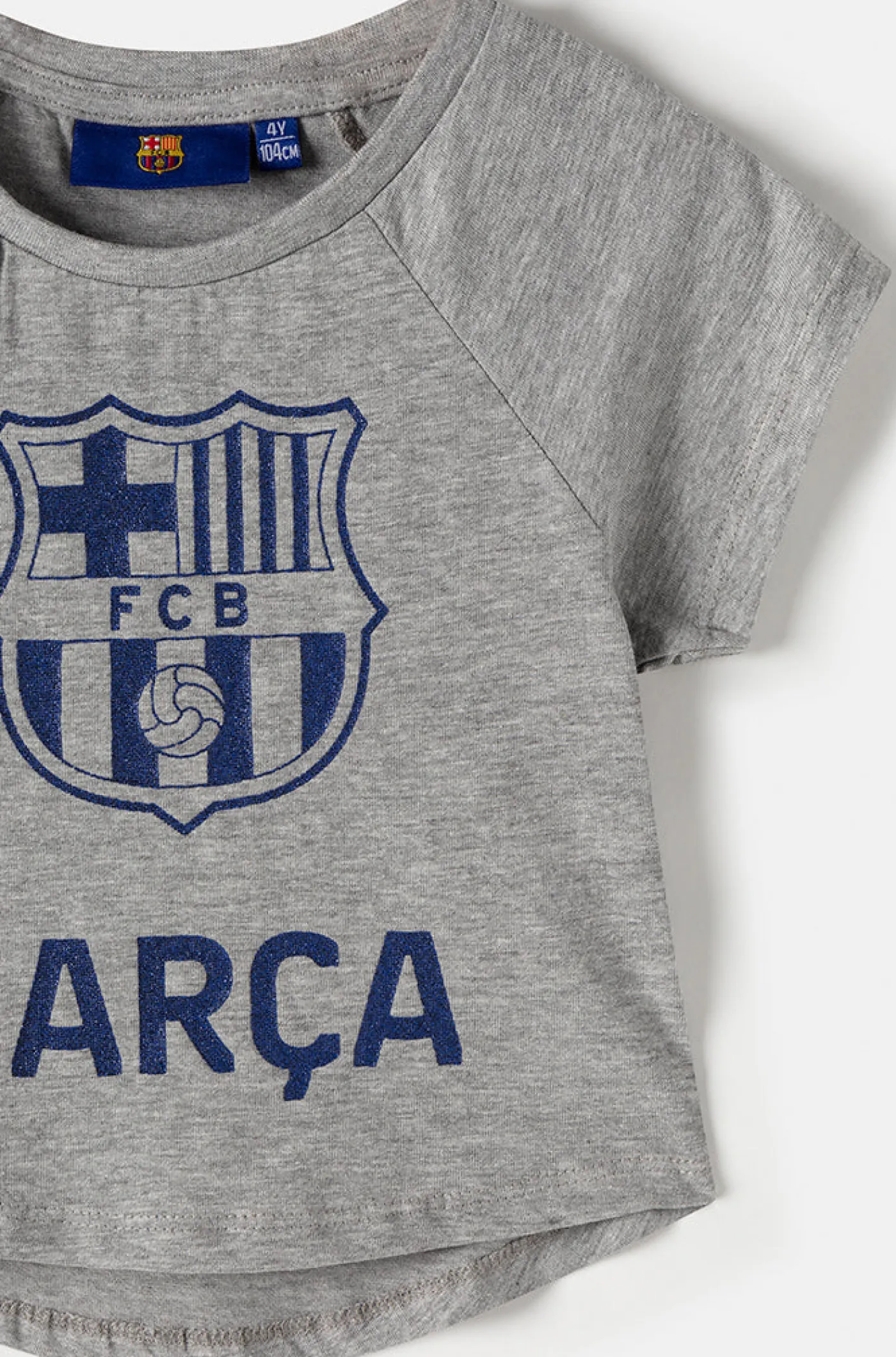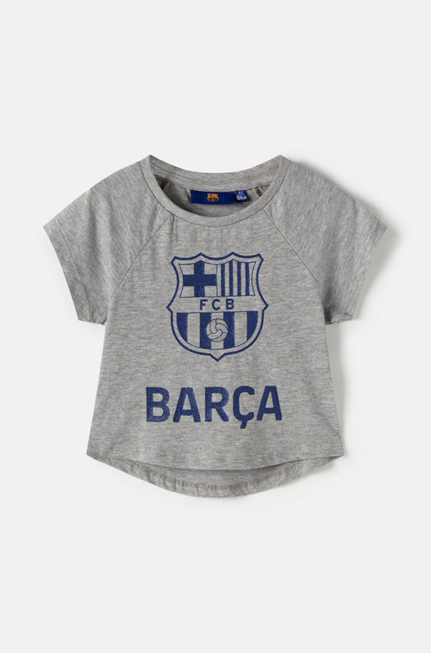 Camiseta niña de manga corta con el escudo en glitter del FC Barcelona. Detalle con logo del Barça. Corte asimétrico. Cuello redondo. Color: Gris jaspeado