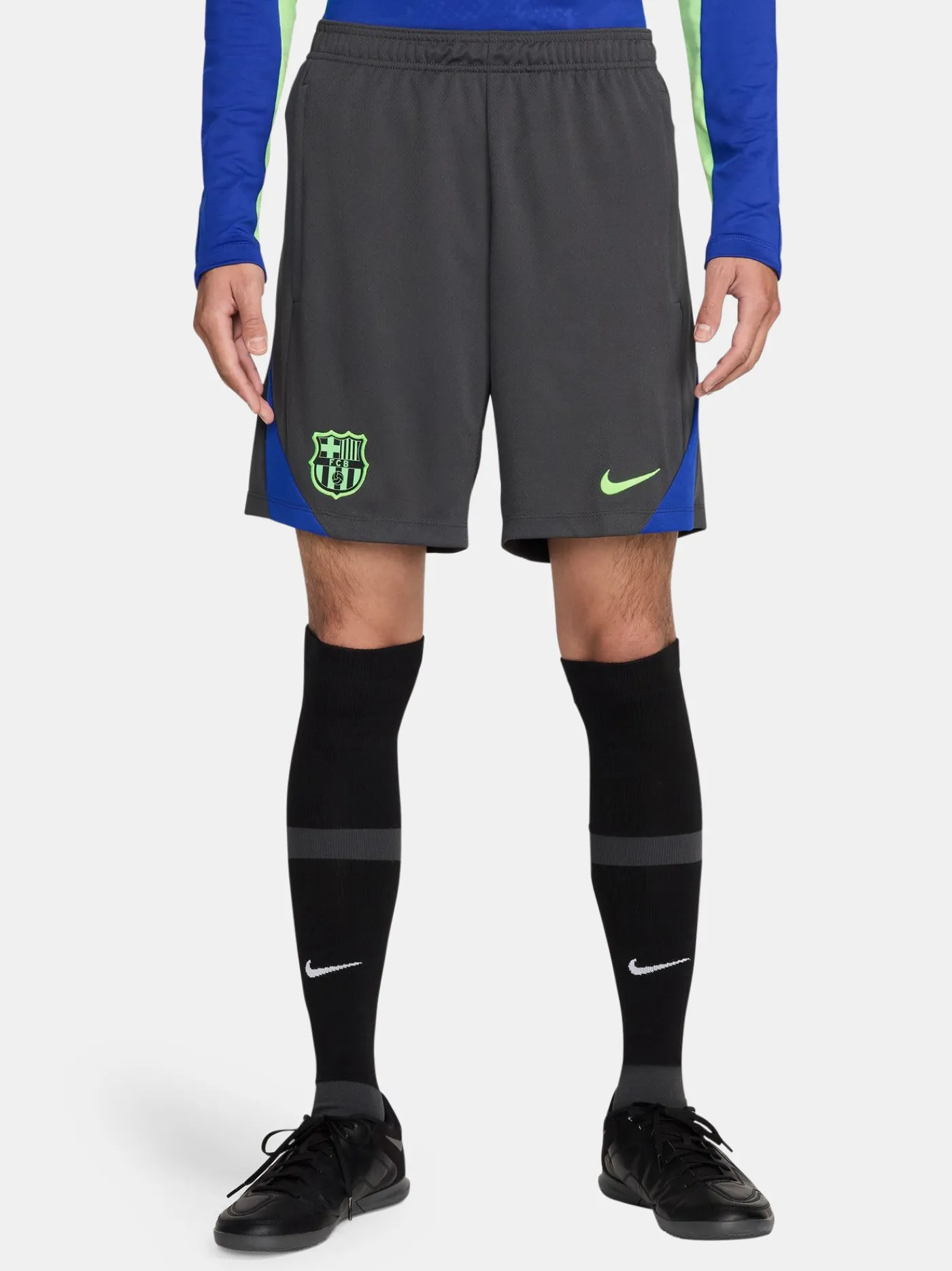 Pantalón corto de entrenamiento con parche del escudo del FC Barcelona y el logo de Nike en la parte inferior. Ambas piernas están decoradas con una franja en diagonal. Cintura elástica con cordón. Dos bolsillos laterales con cremallera. El tejido Nike Breathe mantiene la transpirabilidad y la frescura. Tecnología Dri-FIT de Nike. Color: gris