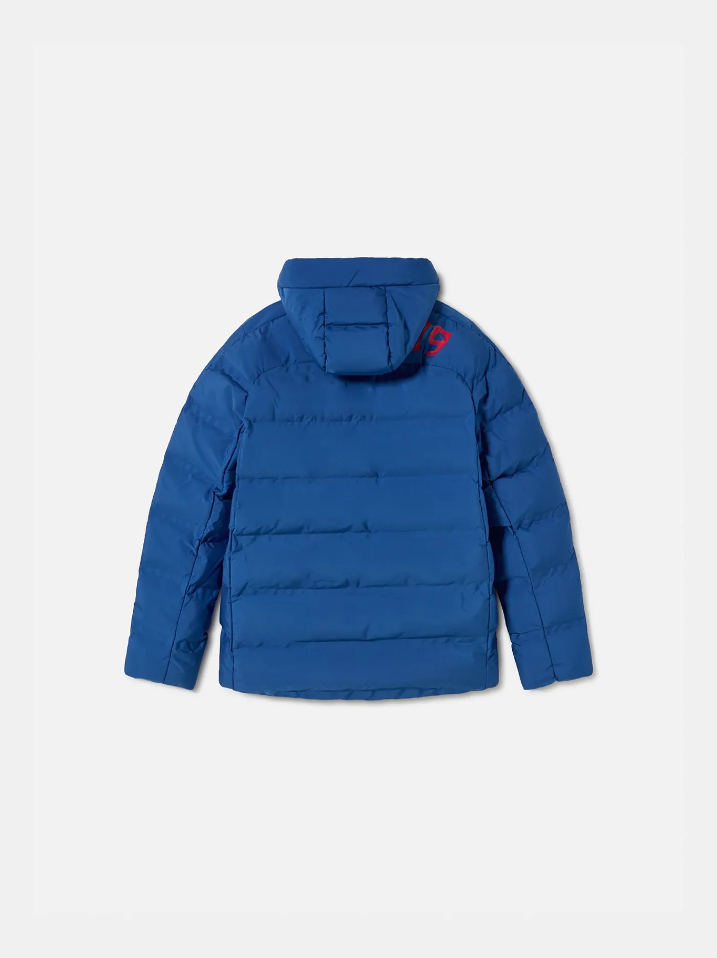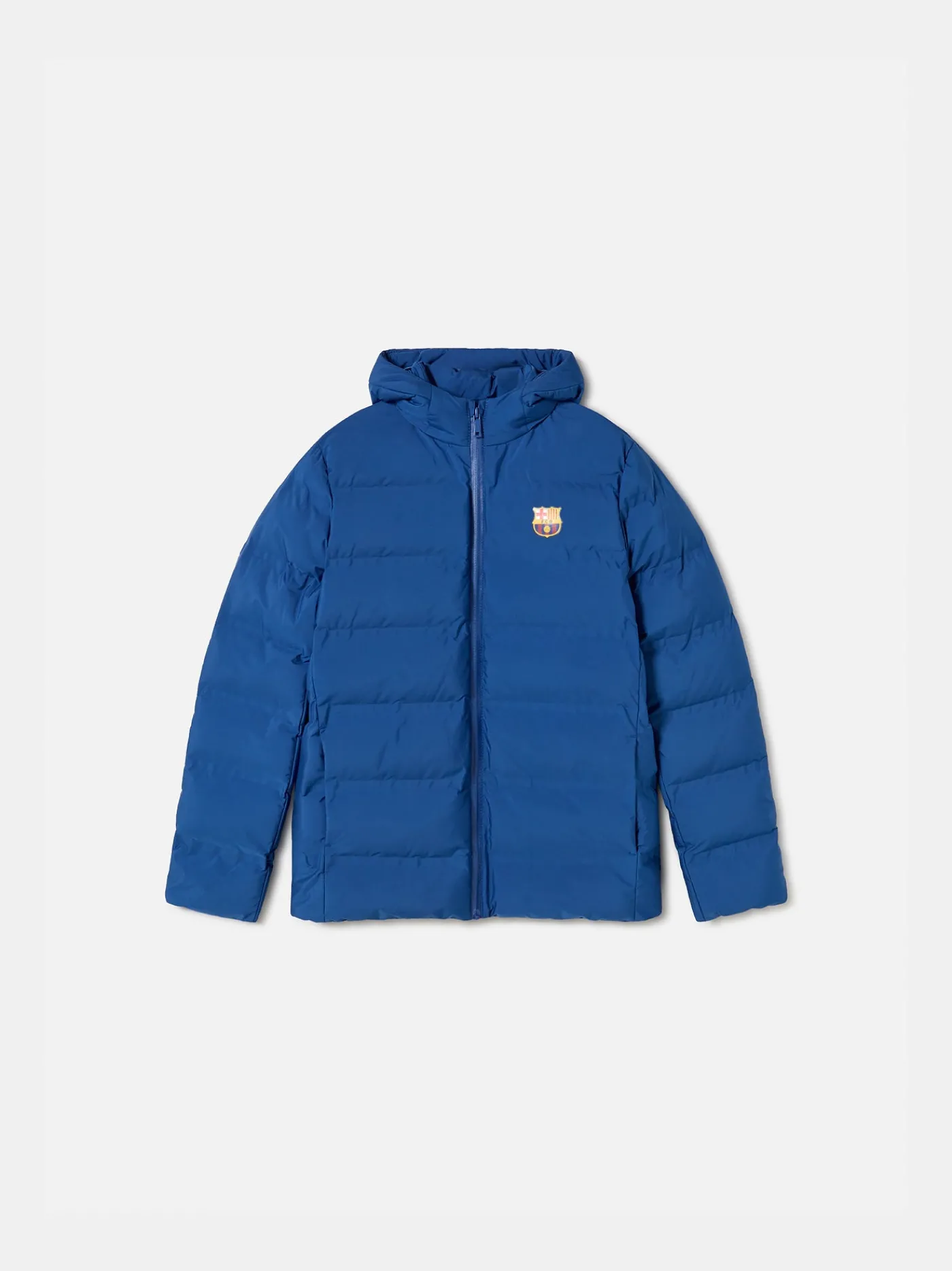 Chaqueta acolchada con capucha ajustable para júnior con el escudo del FC Barcelona y el año de fundación del club, 1899, en el hombro. cuello alto mangas largas Cierre de cremallera impermeable. Cintura ajustable y puños elásticos. Bolsillos delanteros: 2 bajo solapa y cremallera. Color: Azul.
