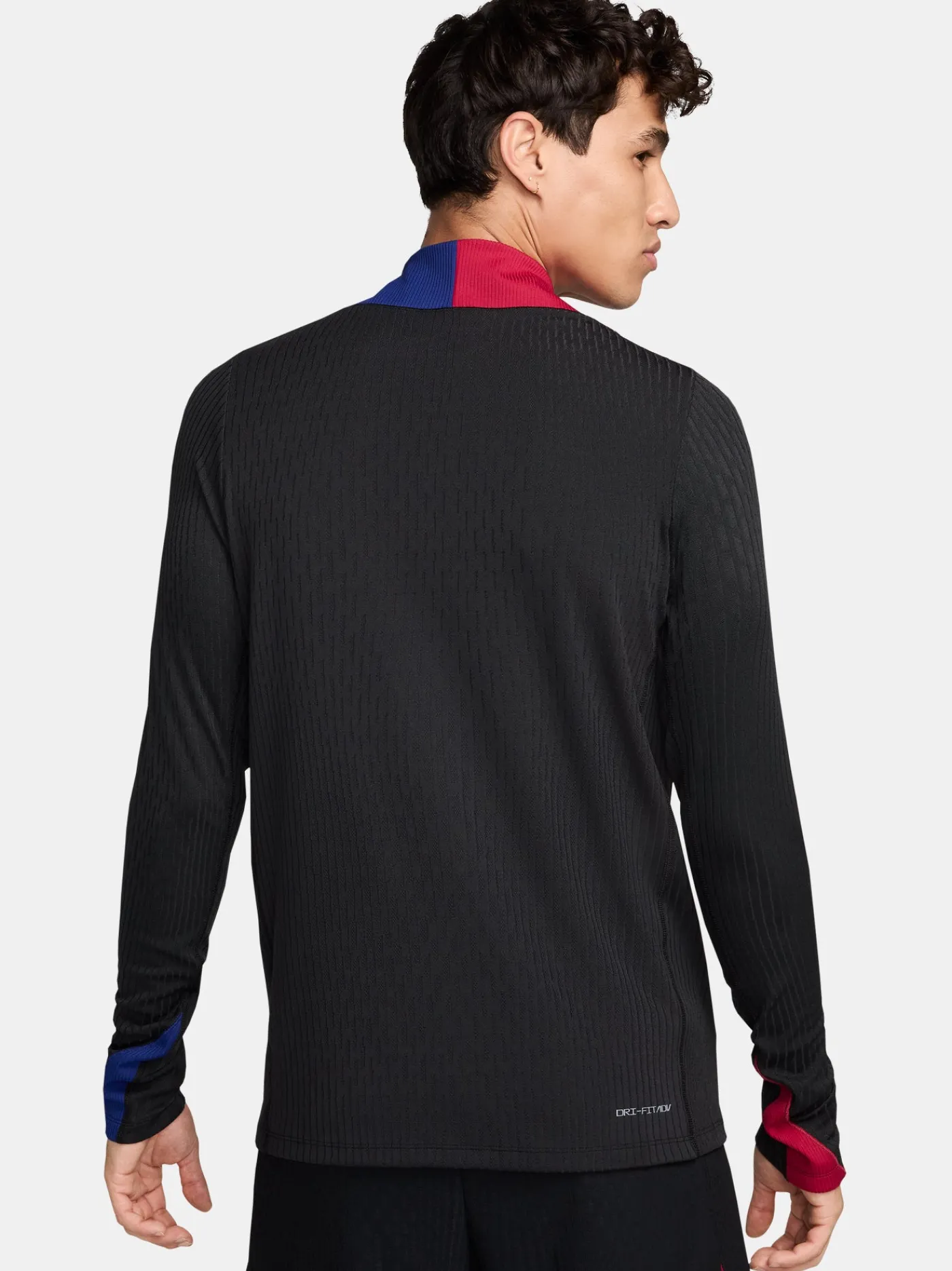 Sudadera de entrenamiento edición jugador con el escudo del FC Barcelona y el logo de Nike. Cuello alto con cierre de cremallera. Manga larga con agujero invisible para el pulgar. Bajo de corte asimétrico. Su tecnología Nike Dri-FIT ADV cuenta con tejido elástico y de secado rápido para evitar rozaduras y combatir la humedad. Color: negro y escarlata.