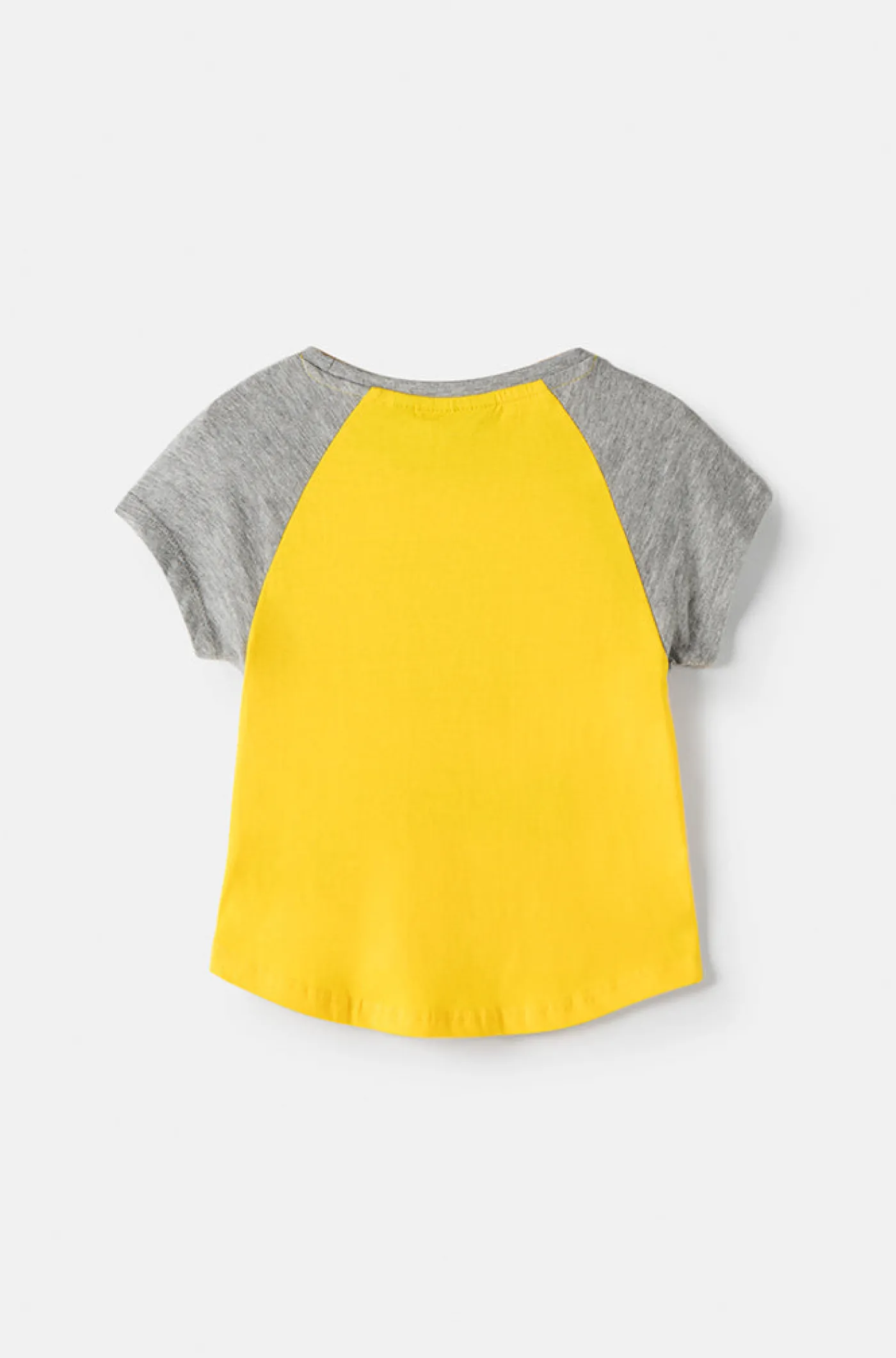 Camiseta niño bicolor de manga corta con el escudo en glitter del FC Barcelona. Detalle con logo del Barça. Corte asimétrico. Cuello redondo. Color: Amarillo y gris jaspeado