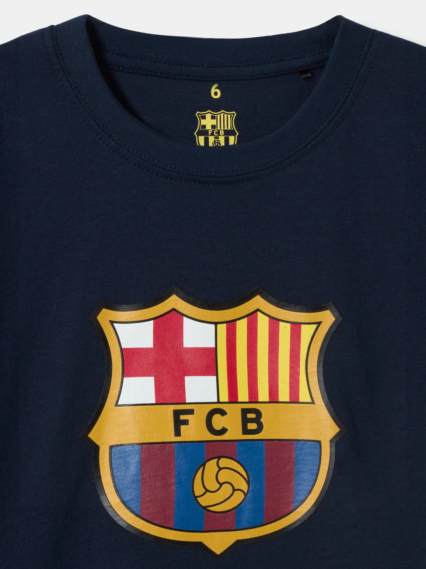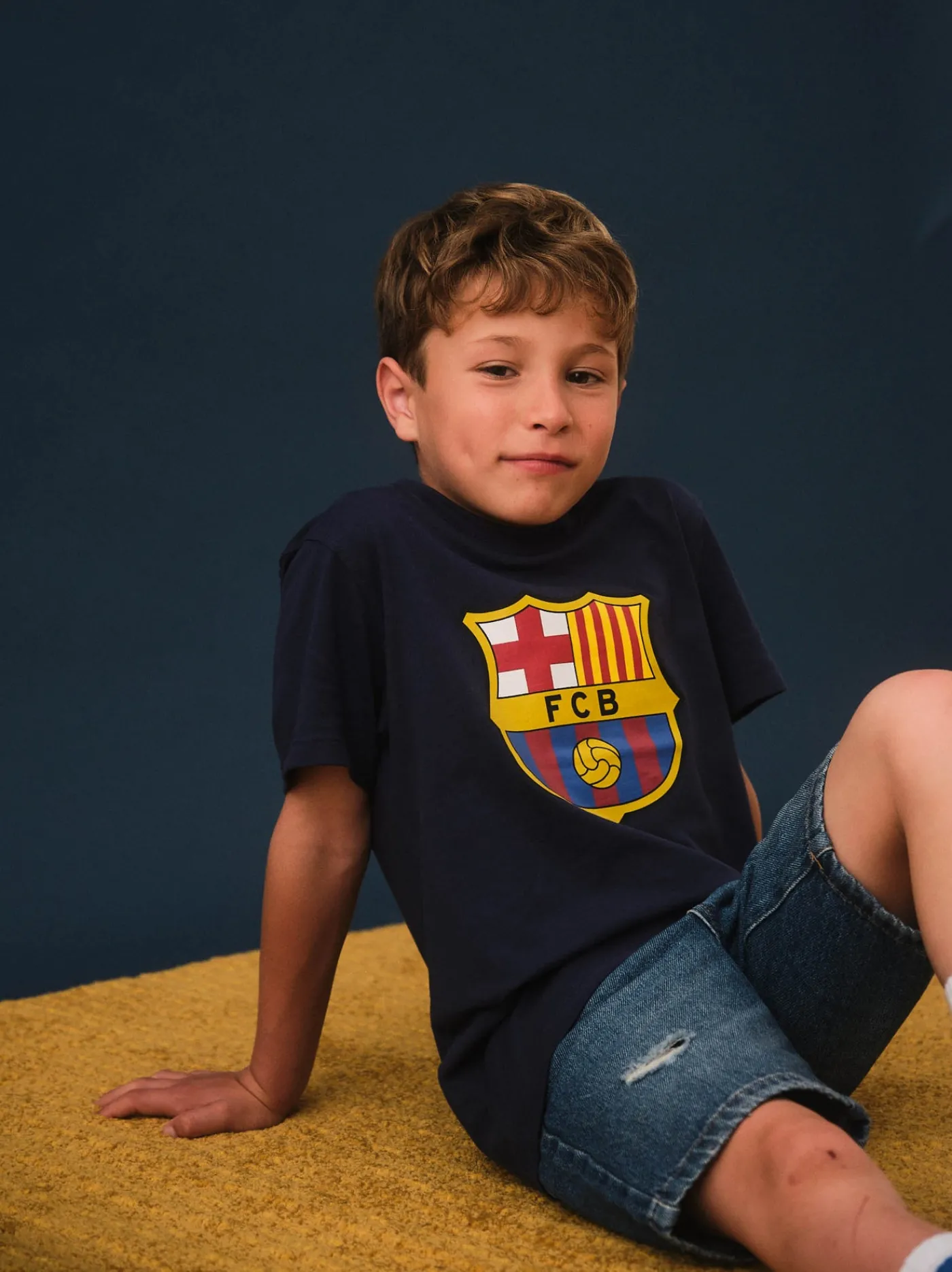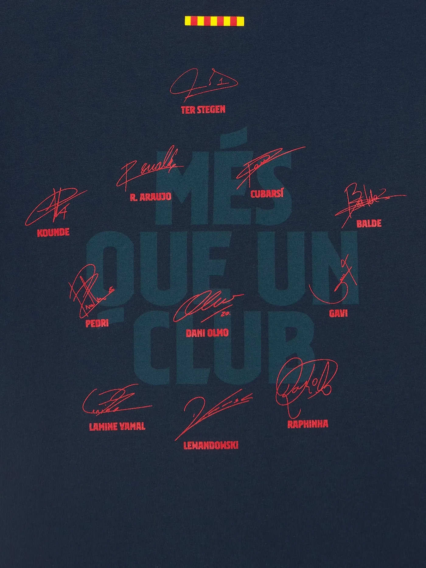 Camiseta azul de manga corta con escudo en el centro. Firma de tus jugadores favoritos en la parte trasera: Ter Stegen, Kounde, R. Araújo, Cubarsí, Balde, Pedri, Dani Olmo, Gavi, Lamine Yamal, Lewandowski y Raphinha.