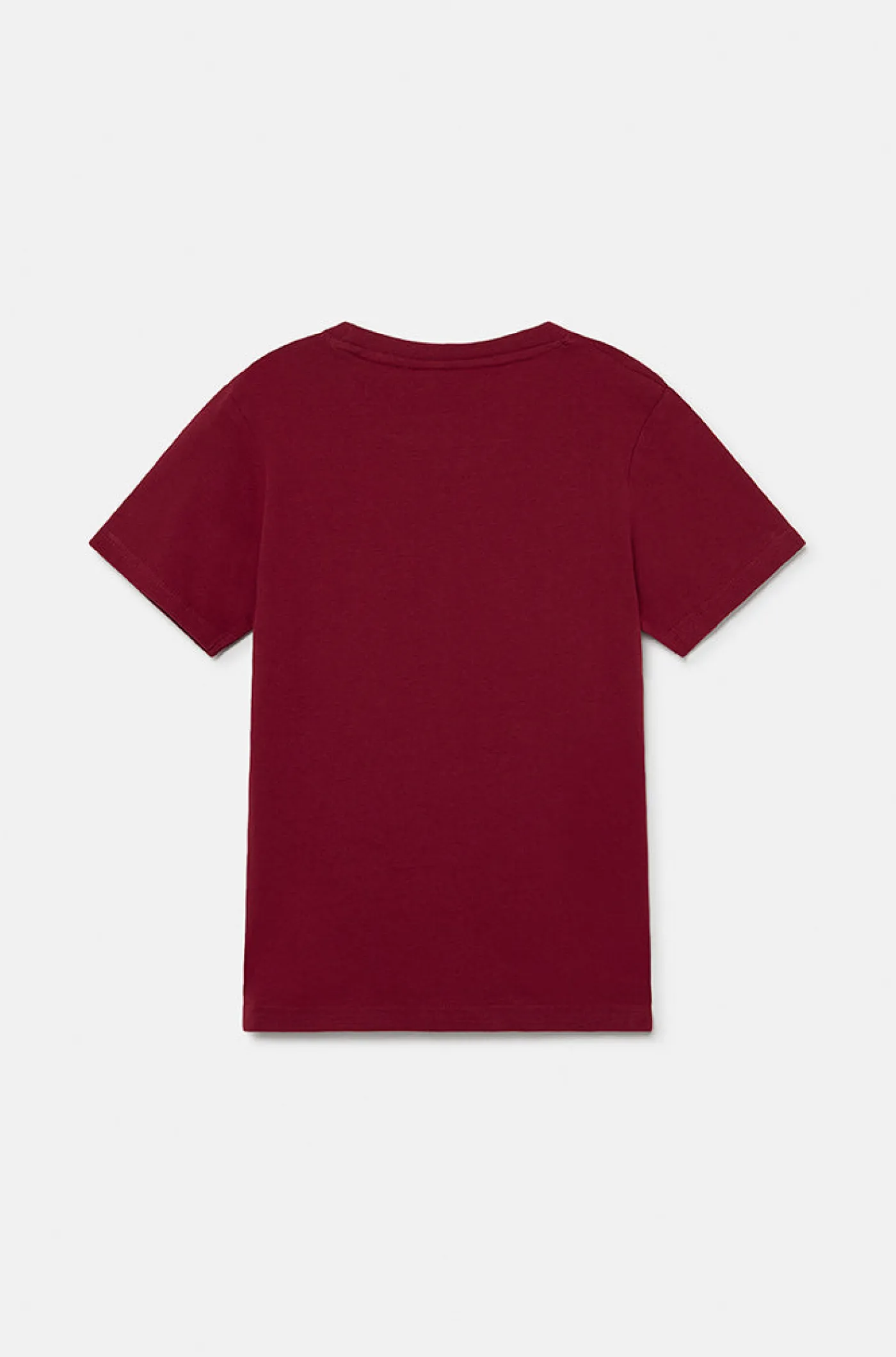 Camiseta niño manga corta con el escudo, la estampación del año que se fundó tu equipo y el texto «Més que un Club». Cuello redondo. Color: Granate.