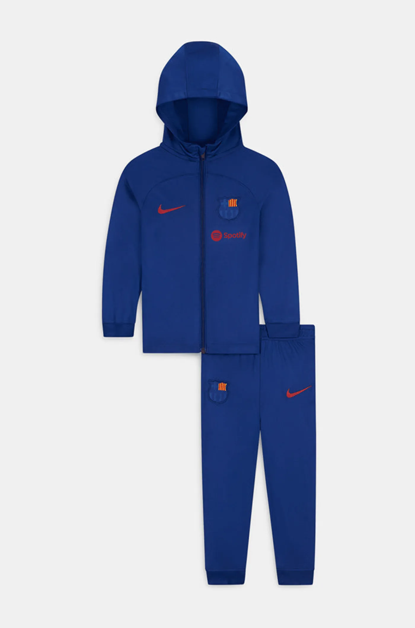 Chándal FC Barcelona de Nike para bebés. Tecnología DRI-FIT de Nike. Chaqueta con cuello alto y manga larga. Cierre con cremallera. Puños elásticos. Cintura elástica y cordón. Color: azul marino.