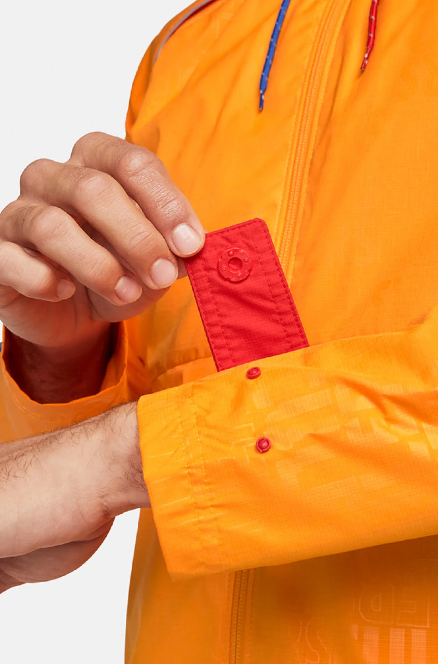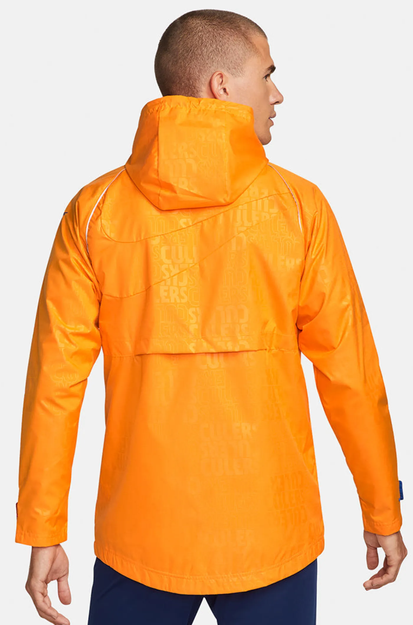 Chaqueta Culers con el parche del escudo del FC Barcelona y el logo de Nike en el pecho. Respiradero en la parte posterior y tela repelente al agua que absorbe el sudor. Cuello alto con capucha fija. Cierre con cremallera. Manga larga con puño elástico. Dos bolsillos laterales con cremalleras. Color: naranja.