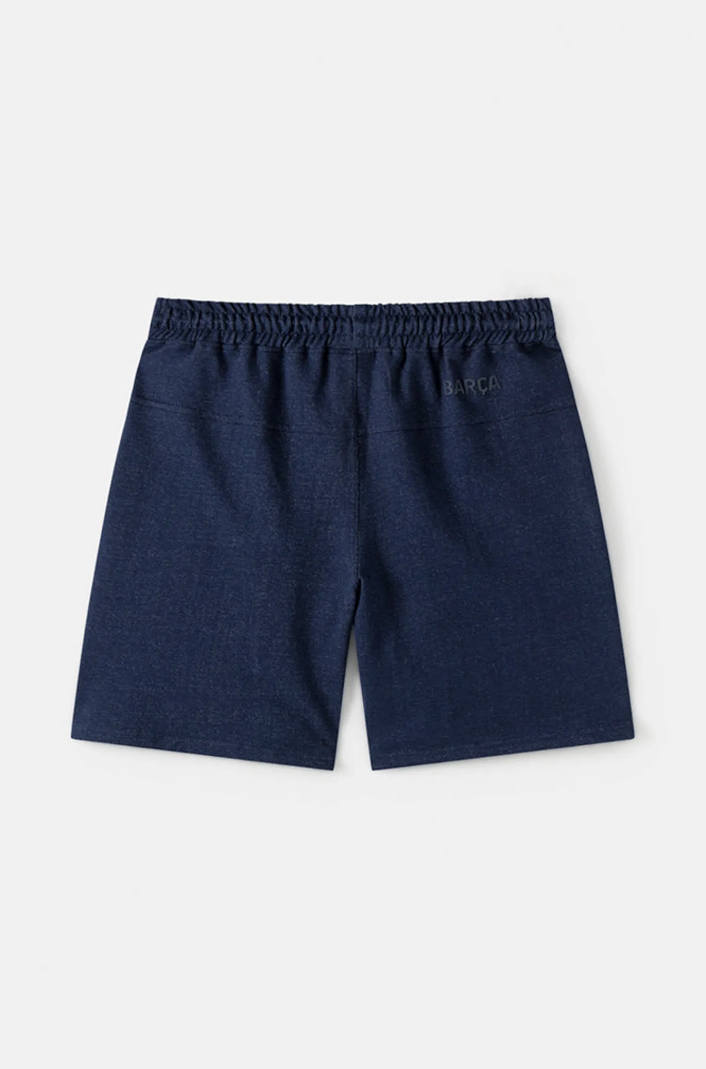 Bermuda con el escudo y logos del FC Barcelona en relieve. Interior de felpa ligera. Efecto jeans. Cintura elástica con cordones para mayor sujeción. Bolsillos delanteros: 2. Color: Marino