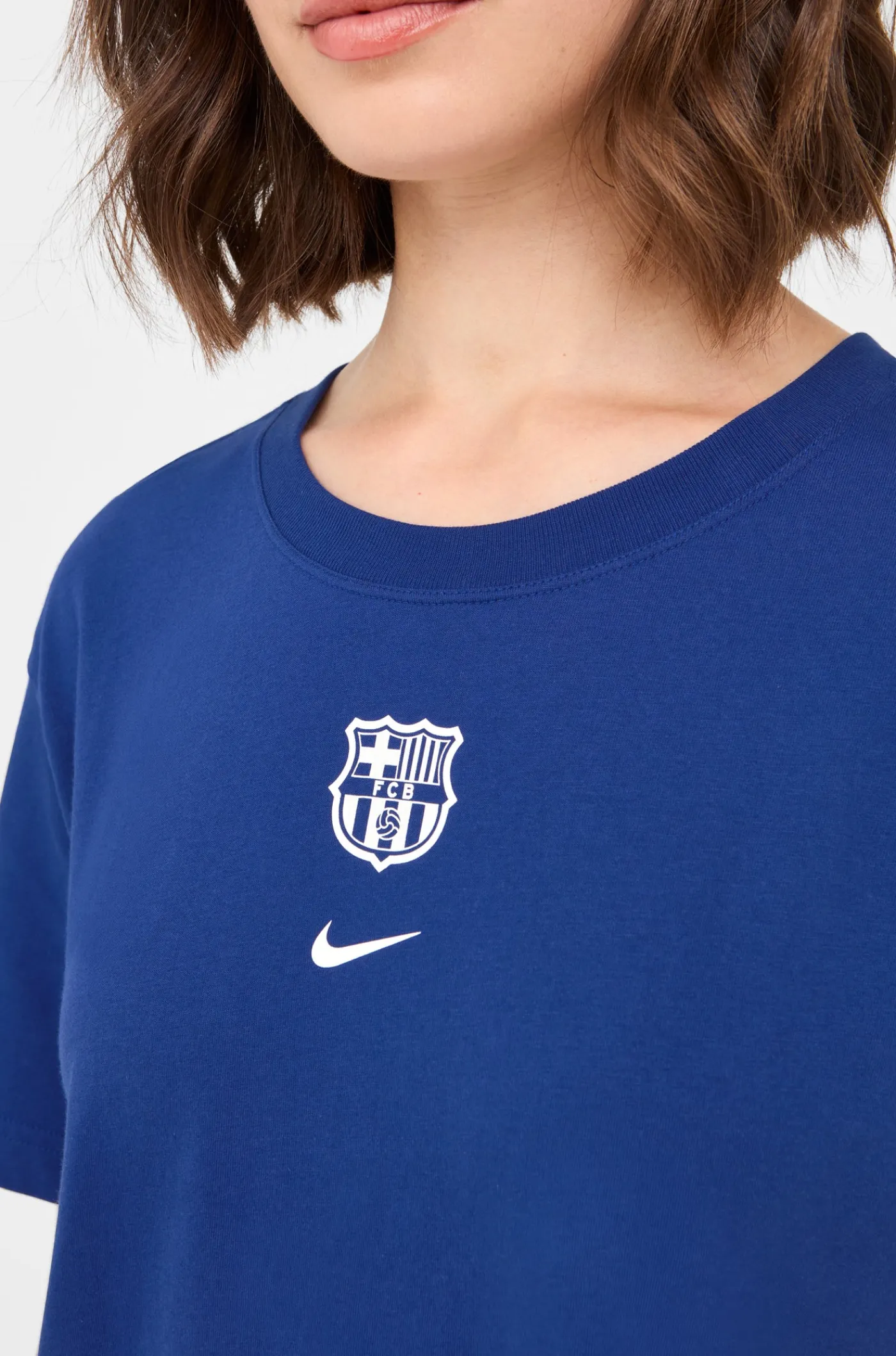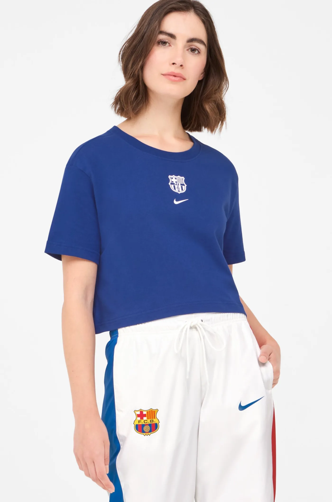 Camiseta de corte crop con el escudo del FC Barcelona bordado en el pecho a contraste. Cuello redondo. Manga corta. Color: azul.