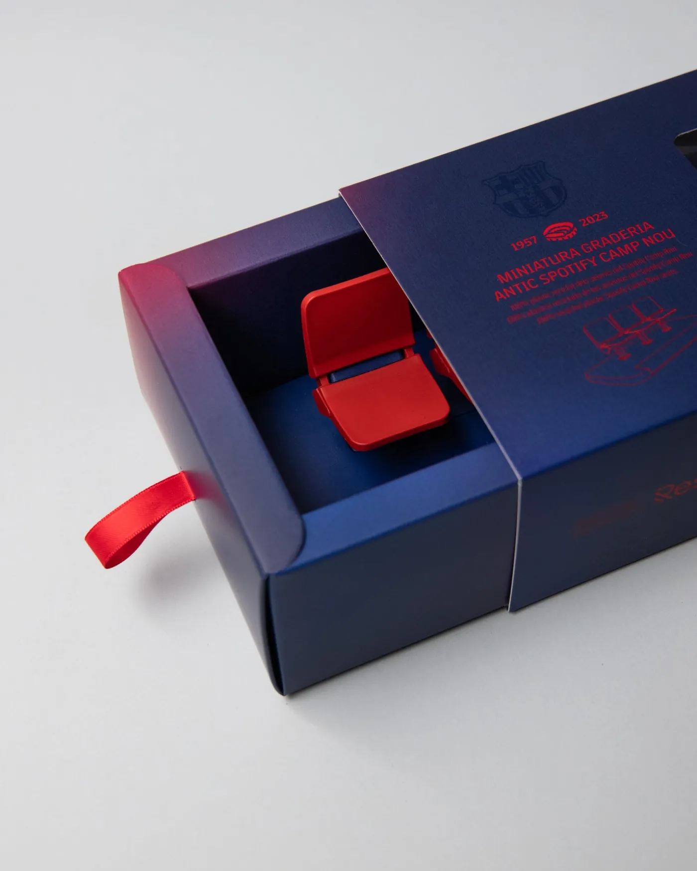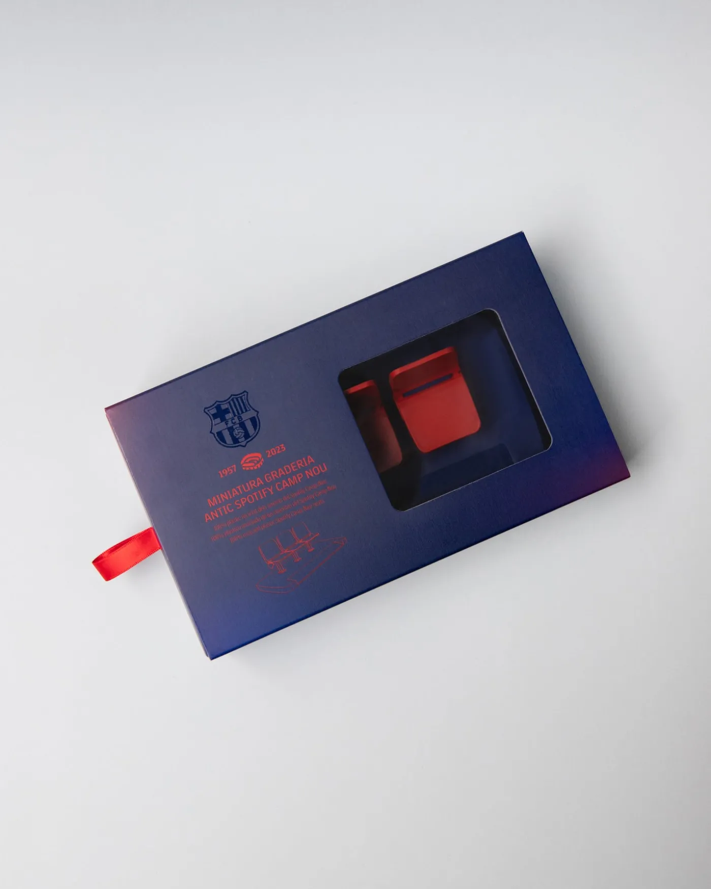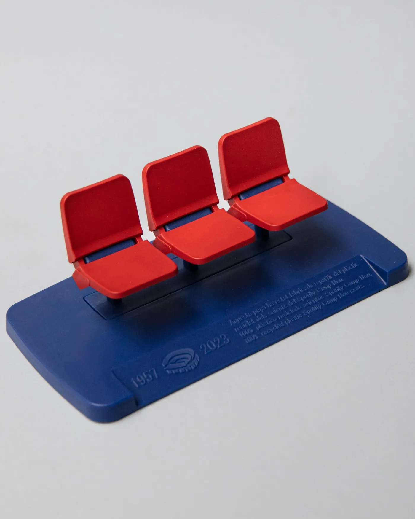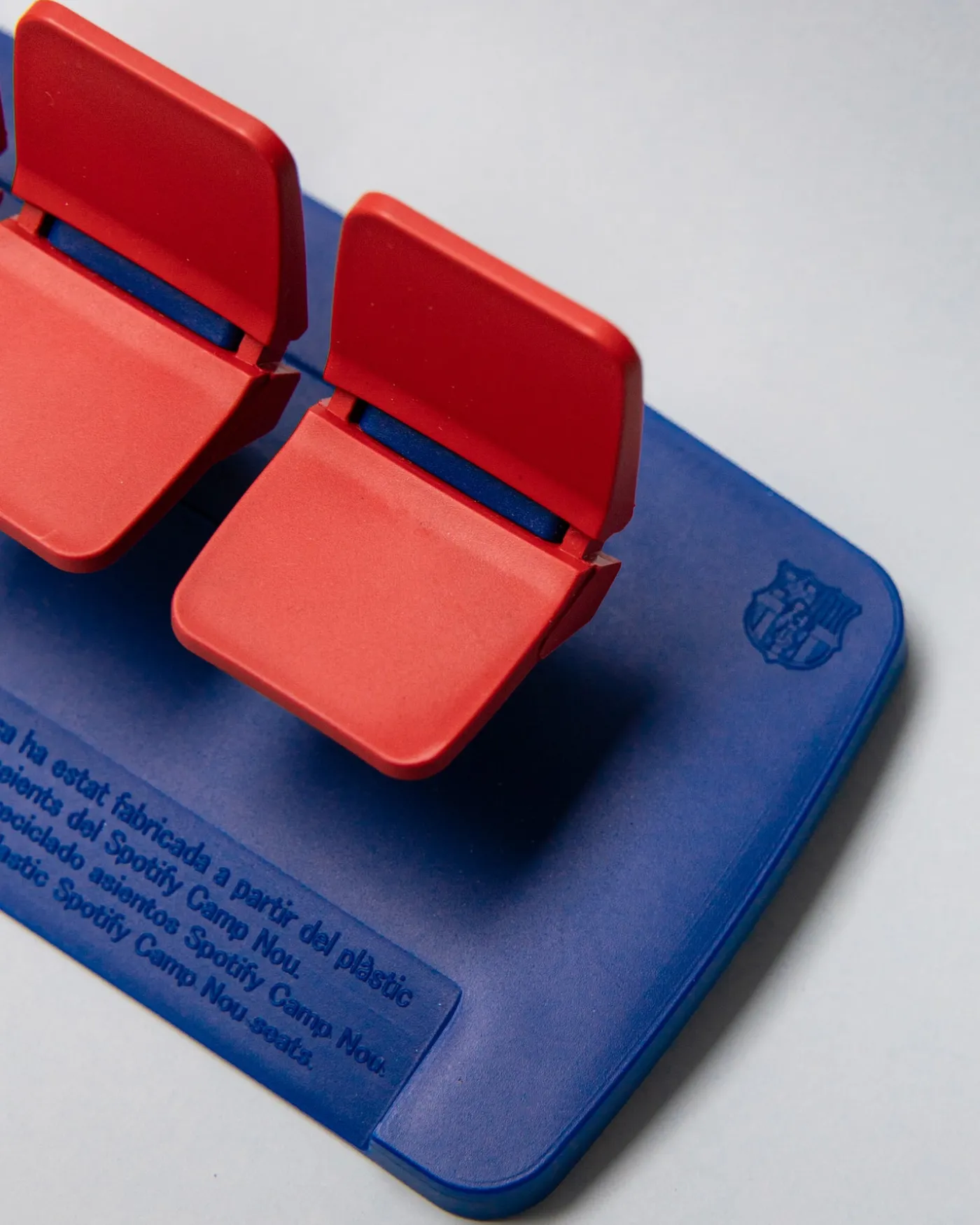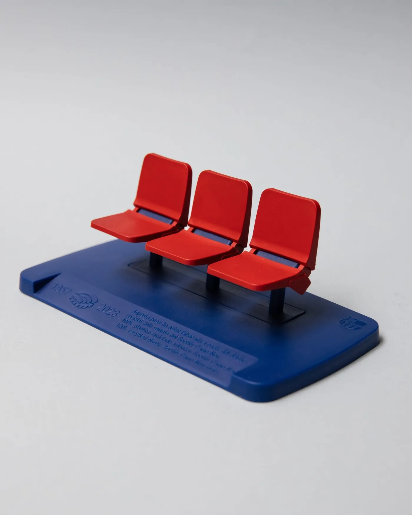 - Fabricado íntegramente con polipropileno reciclado, procedente de los asientos originales del antiguo Spotify Camp Nou. Cada miniatura contiene un pedazo de la historia del estadio.