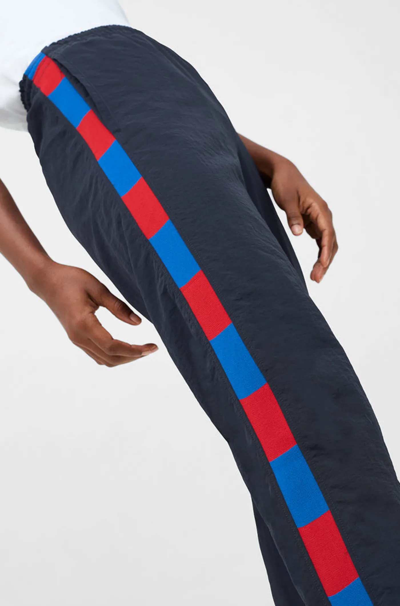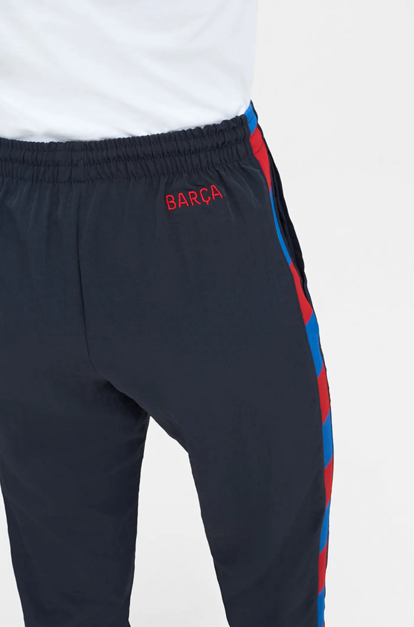 Pantalón deportivo impermeable para mujer con el escudo del FC Barcelona en relieve. Detalle de rotulación Barça en la parte posterior y bandas azulgranas en los laterales. Cintura elástica con cordones interiores. . Bolsillos: 2 delanteros. Bajos elásticos y acanalados. Color: Azul marino