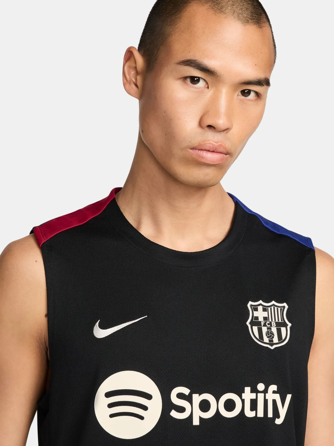 Camiseta de entrenamiento sin mangas. Con el parche del escudo de FC Barcelona y el logo de Nike bordado. Cuello redondo. Tecnología Dri-FIT de Nike. Color: negro.