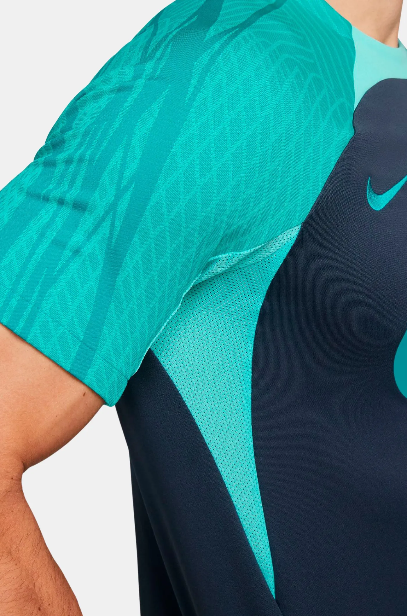 Camiseta de entrenamiento de manga corta. Con el parche del escudo de FC Barcelona y el logo de Nike bordado. Cuello redondo. Manga corta. Tecnología Dri-FIT de Nike. Color: azul y verde.