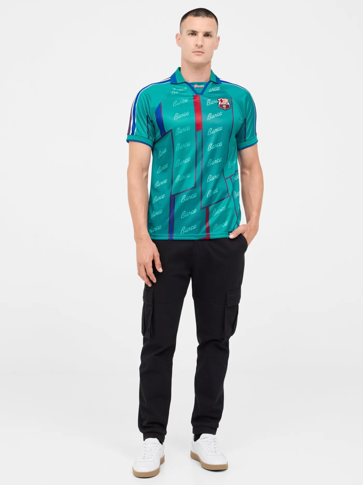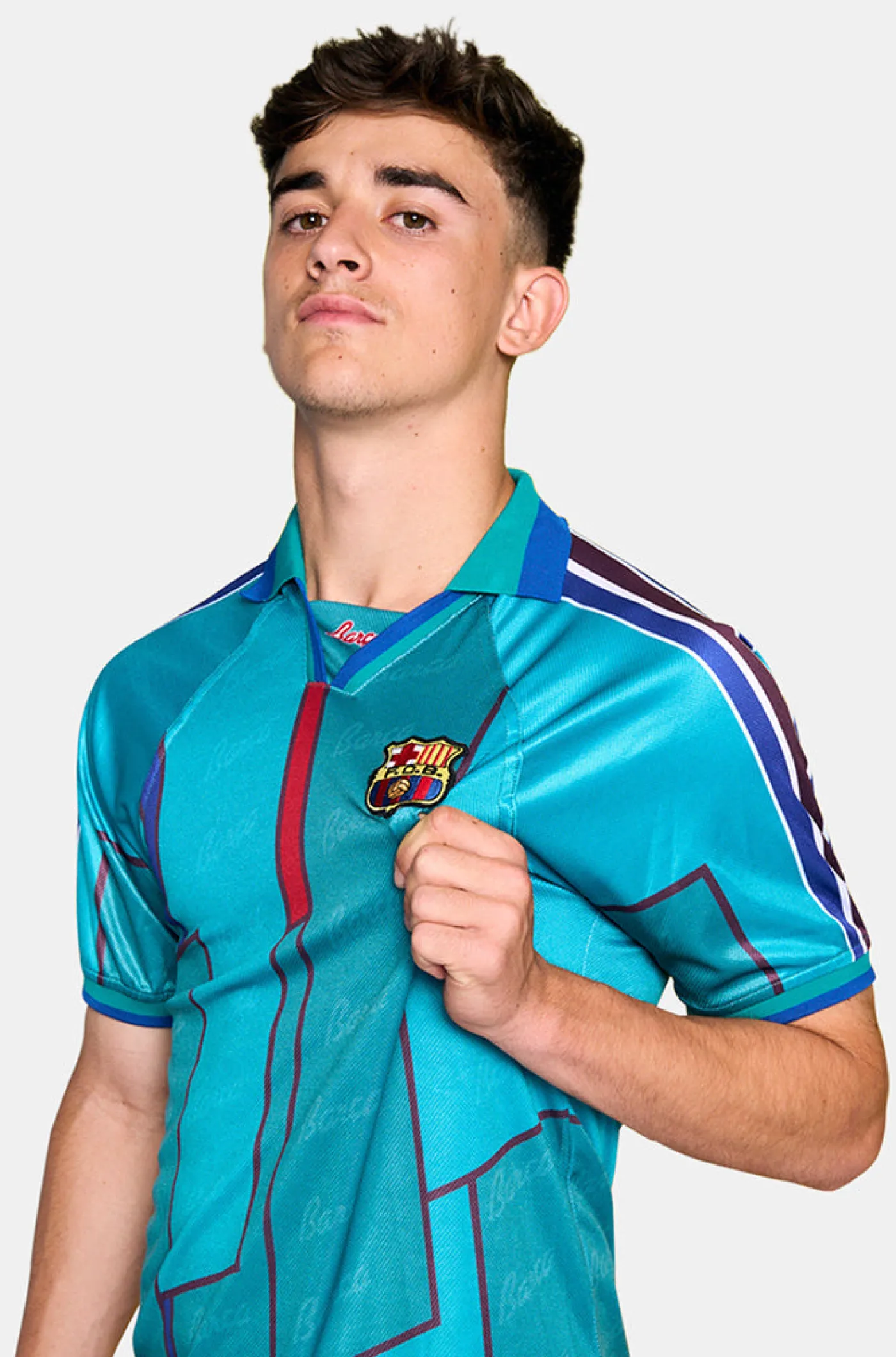 Réplica de la camiseta de la equipación del FC Barcelona en las temporadas 1995-97. Siguiendo el mismo patrón y buscando los tejidos más similares posibles a la original. Cuello con solapa. Manga corta. Color: Azul turquesa.