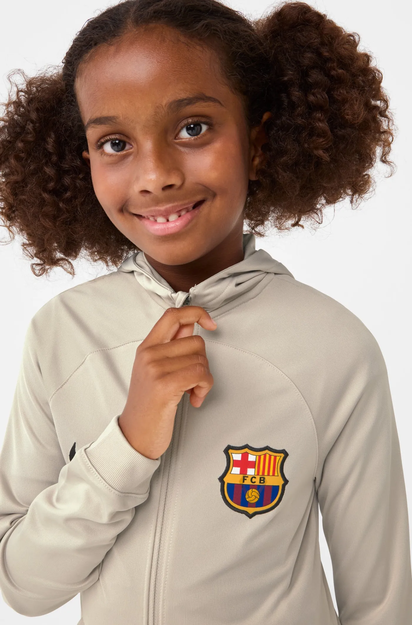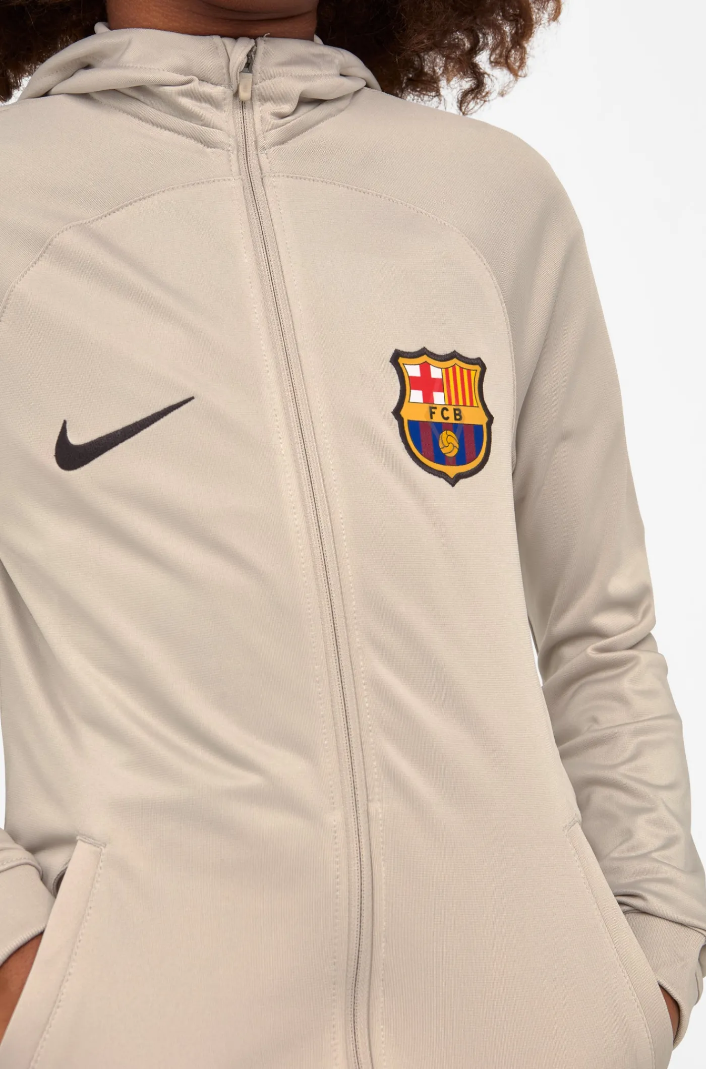 Chándal de entrenamiento para niños/as de 6 a 14 años con el parche del escudo del FC Barcelona y el logo de Nike bordado a contraste. Tecnología Dri-FIT de Nike. Chaqueta con capucha y cuello alto. Cierre con cremallera. Bolsillos delanteros con cremallera. Pantalón largo con cintura elástica con cordones en su interior. Bajos con cremallera. Color: beige y verde.