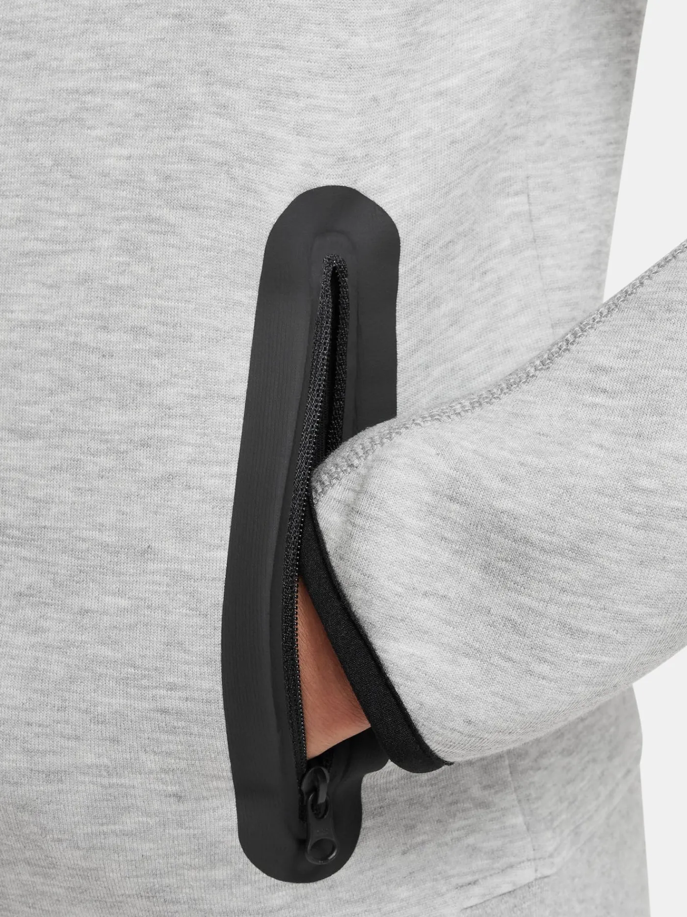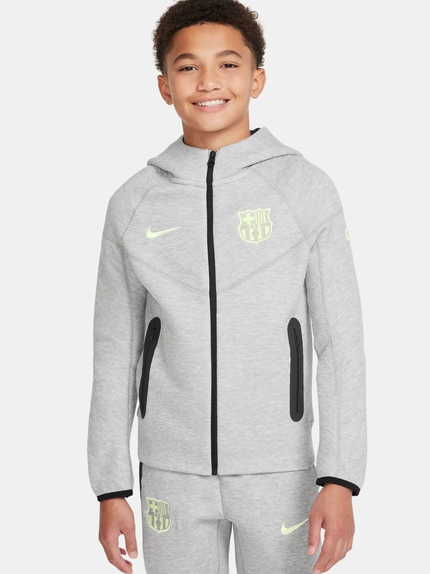 Chaqueta del FC Barcelona de la temporada 24/25 para niños de 6 a 14 años. Con el escudo del FC Barcelona y logo de Nike a contraste bordado en el pecho. Mangas largas. Presenta capucha y cierre con cremallera. Dos bolsillos abiertos en la parte delantera y un bolsillo con cremallera en la manga. Color: gris