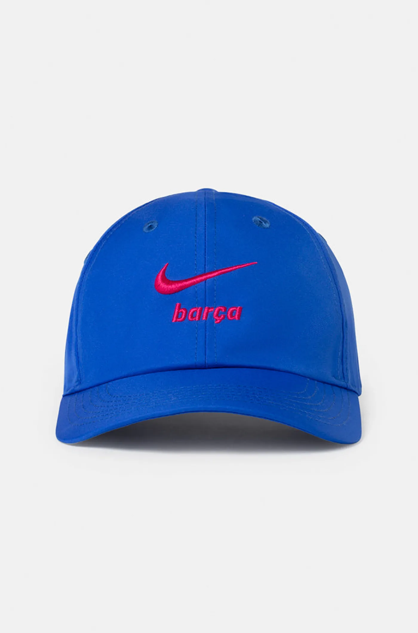 Gorra con los logos del Barça y Nike bordados a contaste. Detalle del escudo del FC Barcelona en la parte posterior. Visera semirrígida. Cúpula con ojales para una mejor transpiración. Ajustable mediante hebilla en la parte posterior. Color: azul.