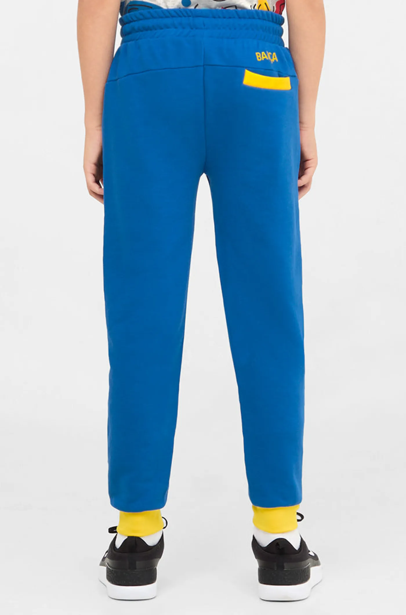 Pantalón para niños y niñas del FC Barcelona. Detalle del escudo en la parte frontal y lettering «BARÇA» en el bolsi…