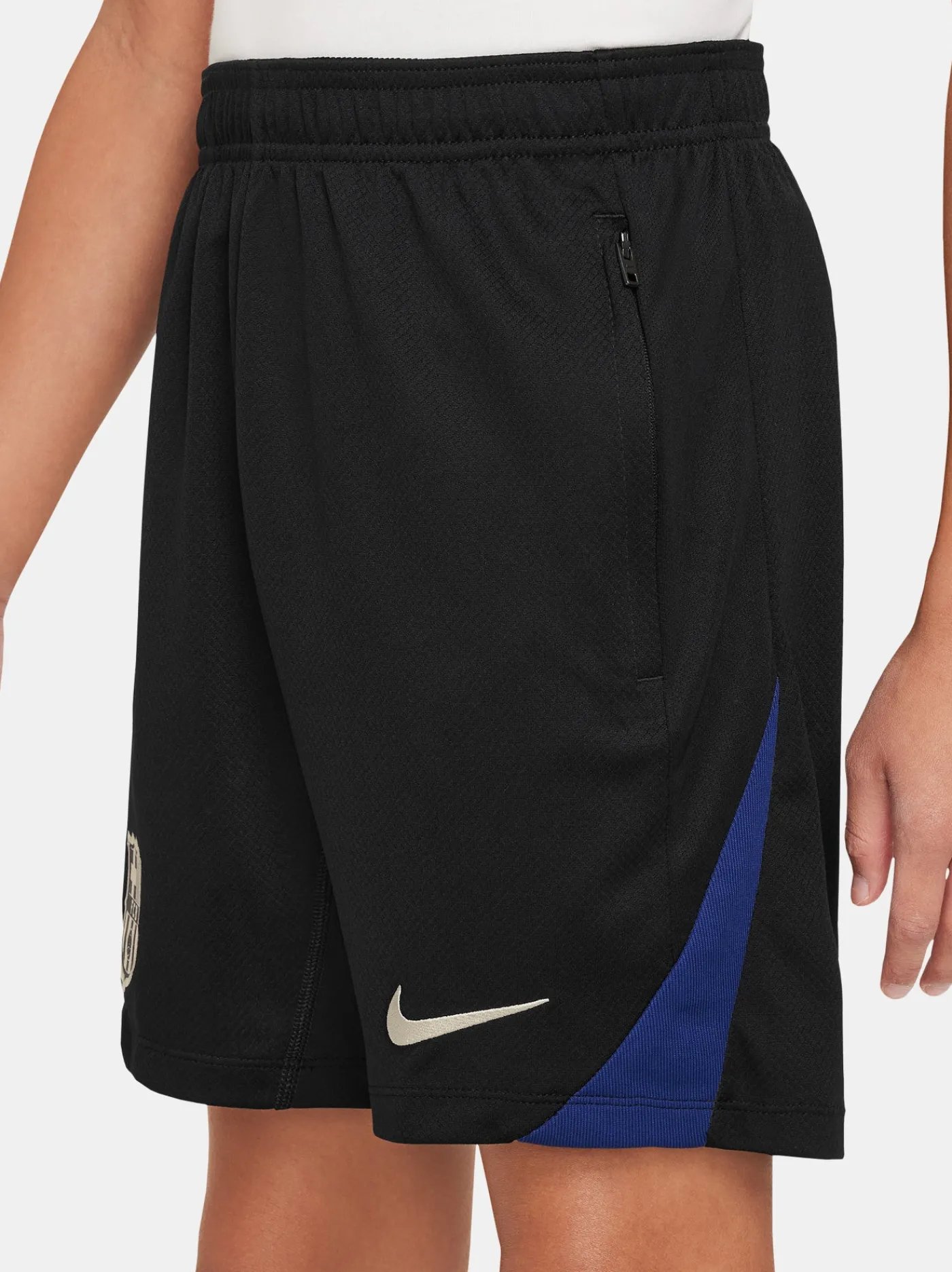 Pantalón corto de entrenamiento para niños de 6 a 14 años con parche del escudo del FC Barcelona y logo de Nike bordado en el bajo. Ambas piernas presentan una raya diagonal. Cinturilla elástica con cordón. Dos bolsillos laterales con cremallera. El tejido Nike Dri-FIT mantiene la transpirabilidad y la frescura. Tecnología Nike Dri-FIT. Color: negro.