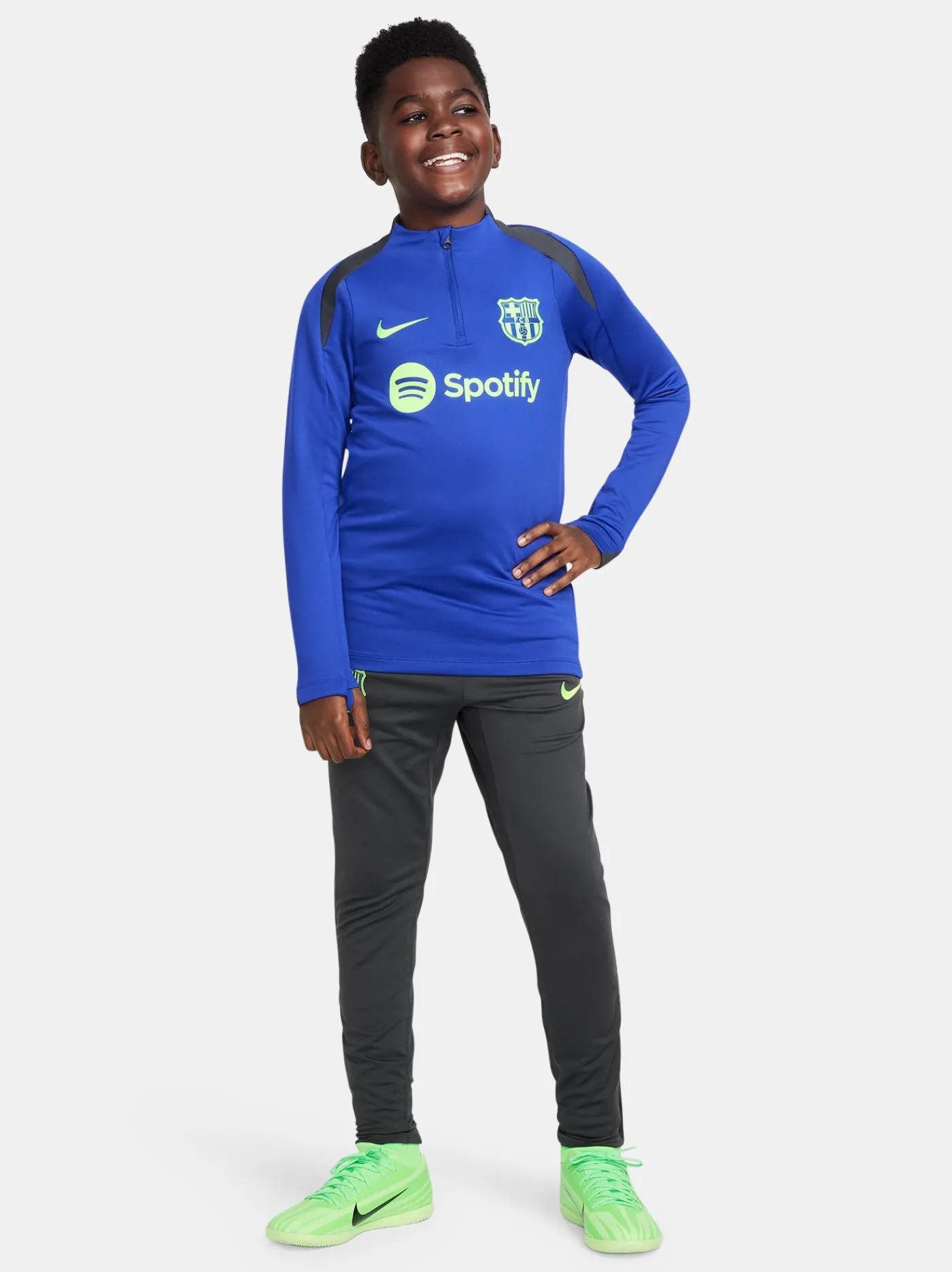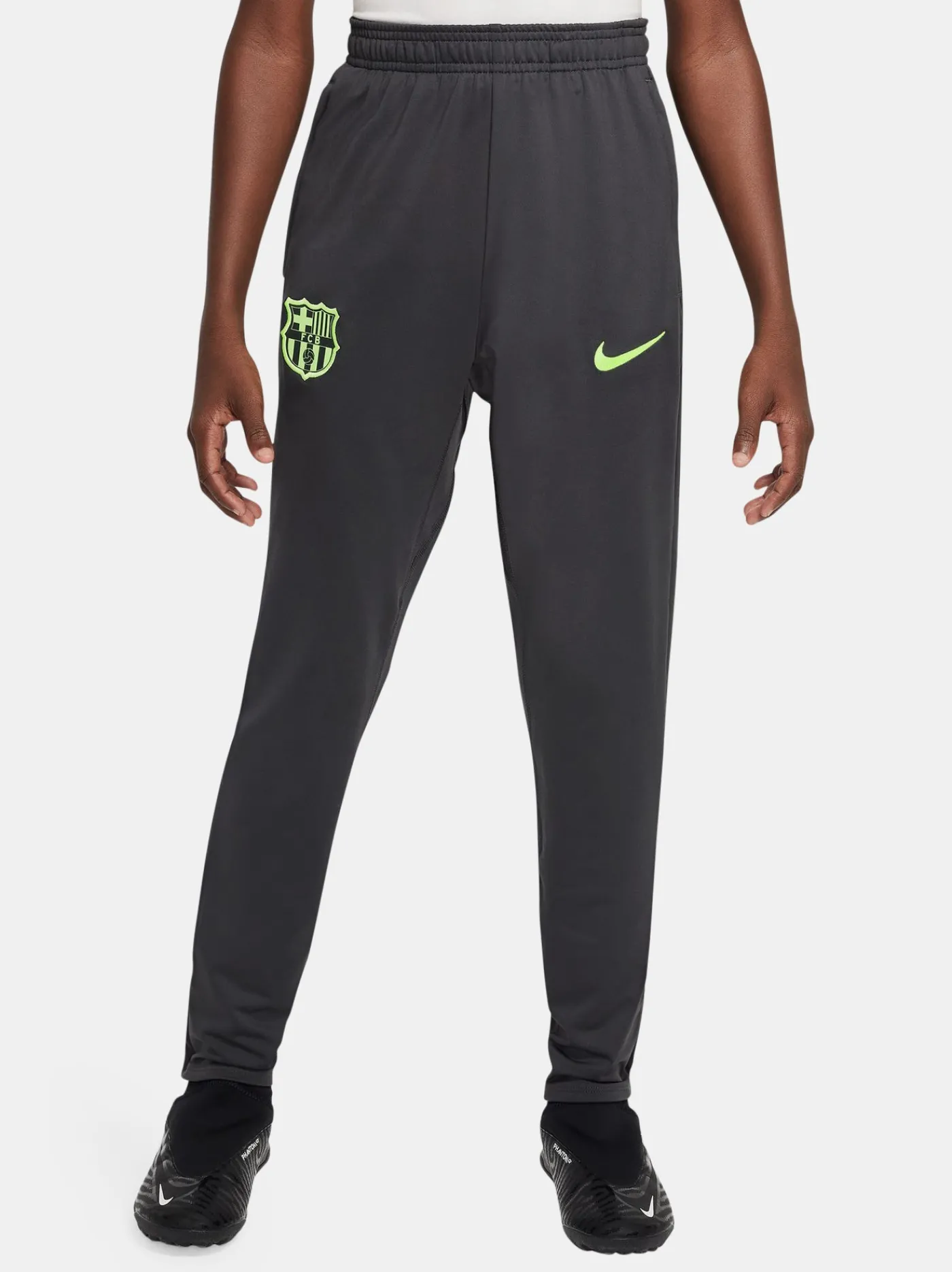 Pantalón de entrenamiento para niños de 6 a 14 años con escudo del FC Barcelona bordado y logo de Nike. Cintura elástica con cordón. Bolsillos delanteros. Piernas con cremalleras. Tecnología Nike Dri-FIT. Color: gris
