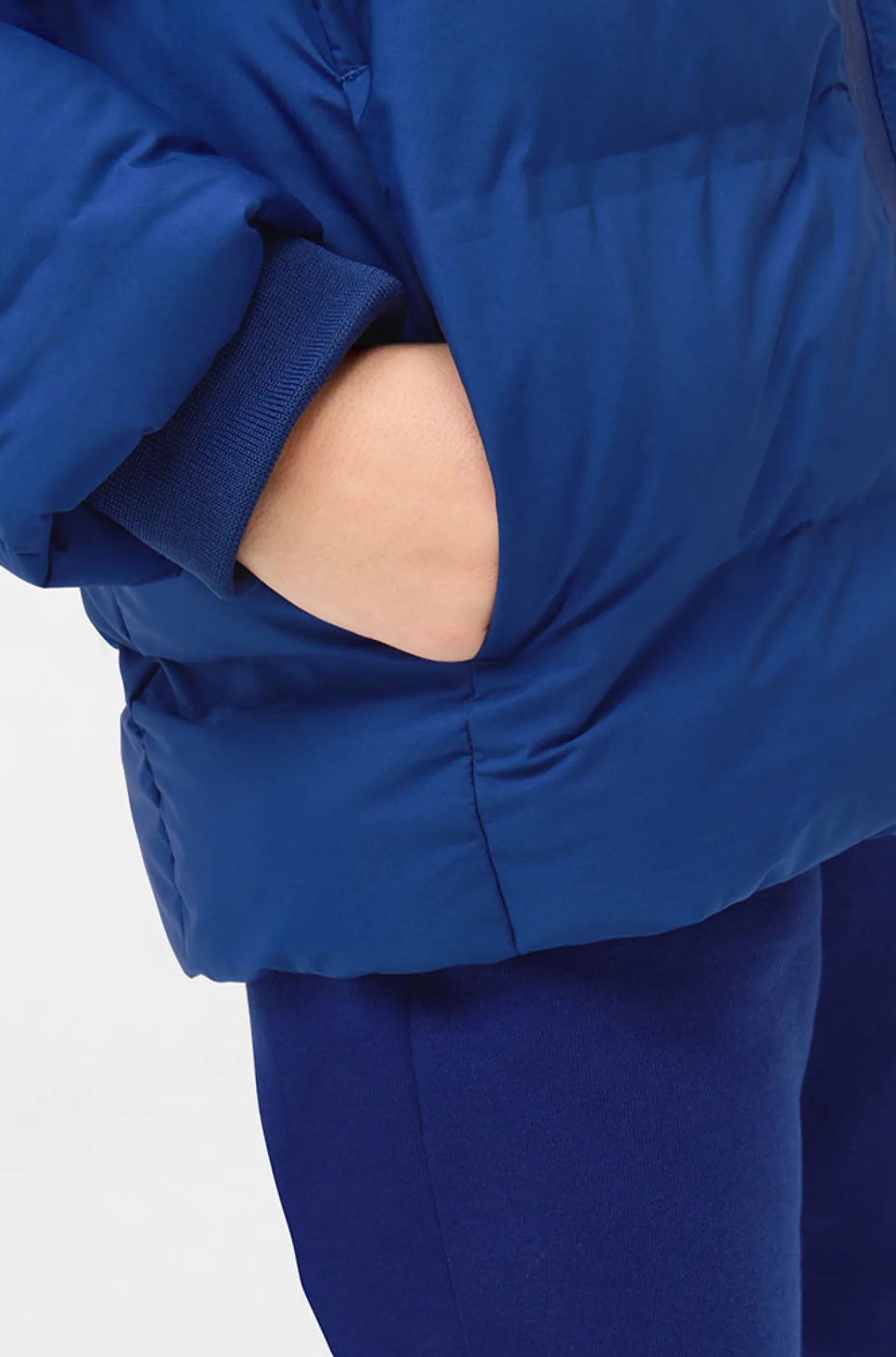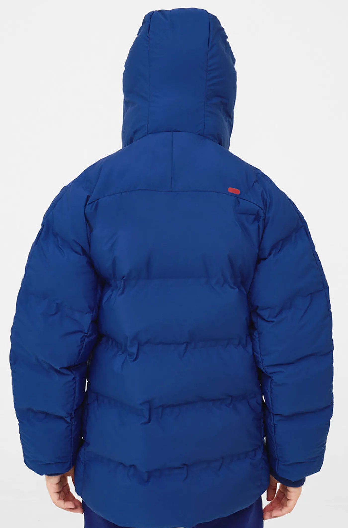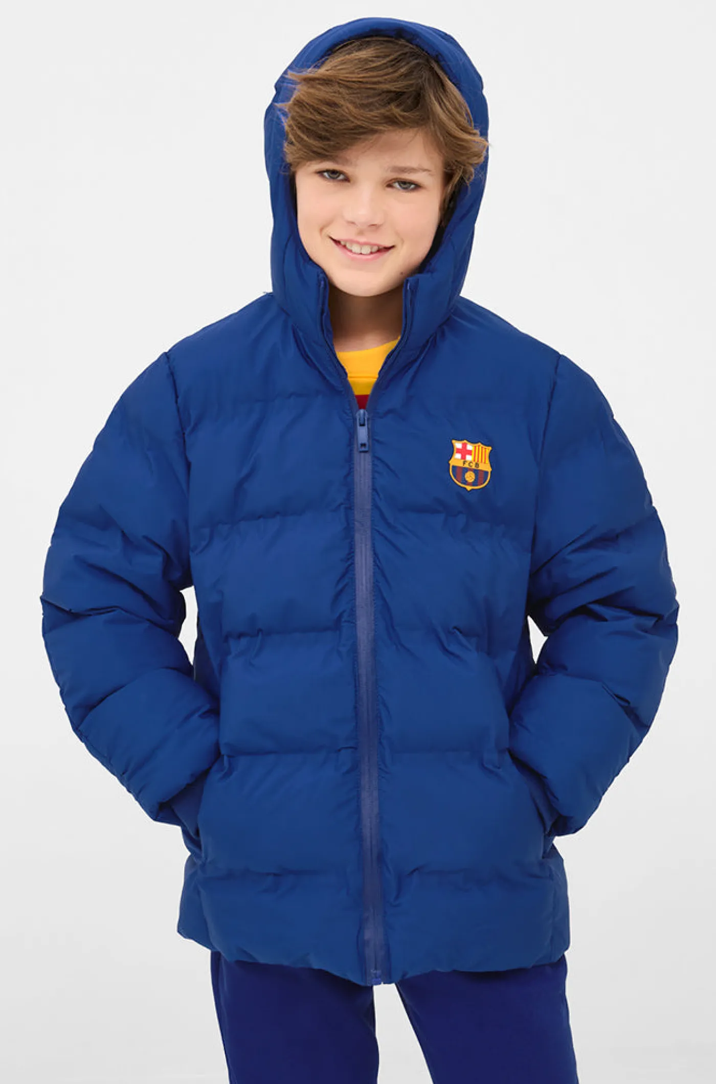 Abrigo acolchado del FC Barcelona para niños. Cuenta con relleno sintético. Cuello con capucha. Manga larga. Cierre con cremallera. Bolsillos delanteros: 2 con cremallera. Color: Azul