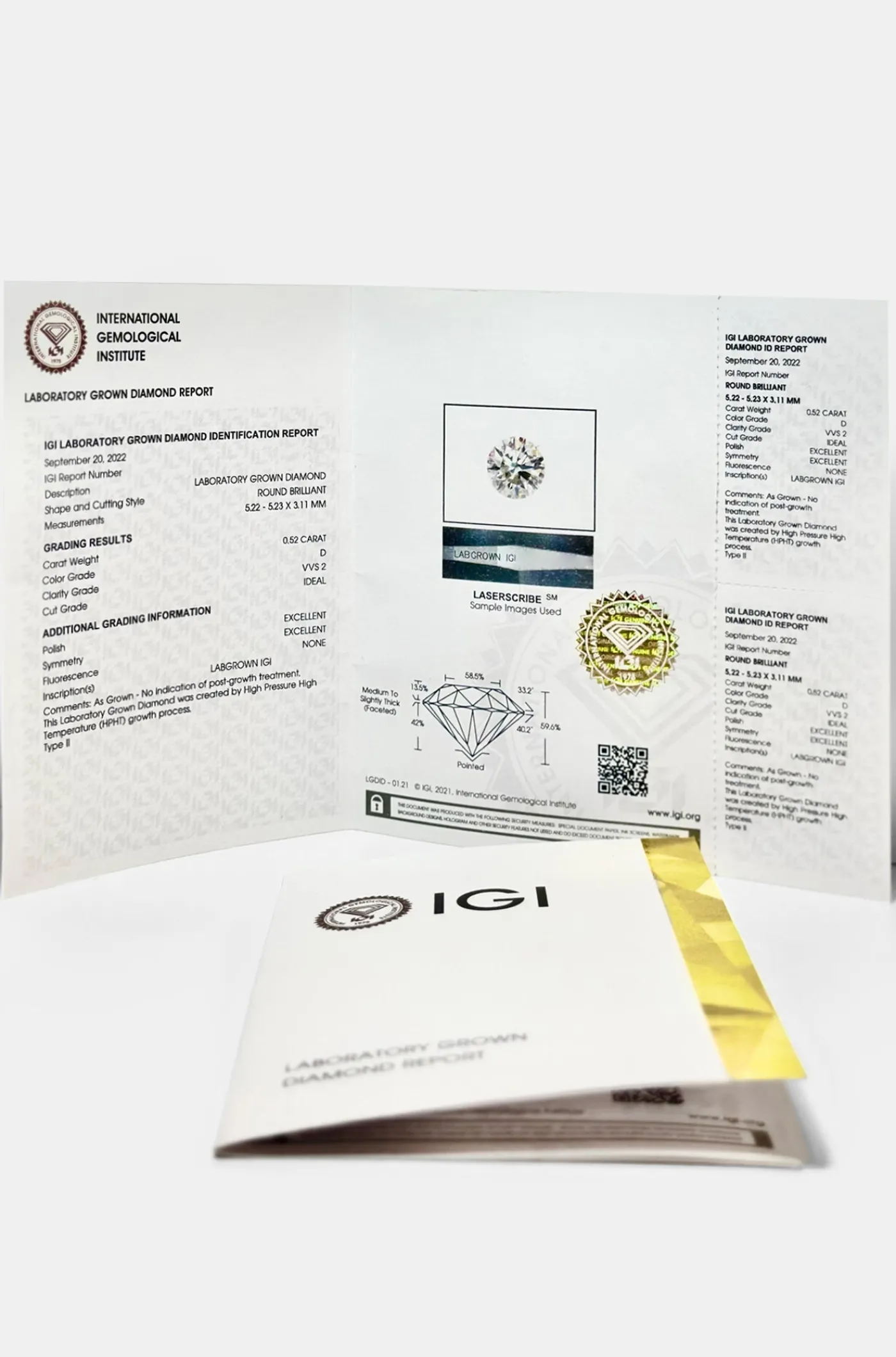 - Certificación IGI: todos los diamantes se acompañan de un certificado de autenticidad que detalla el origen del carbono, las características del diamante y la certificación de la serie.