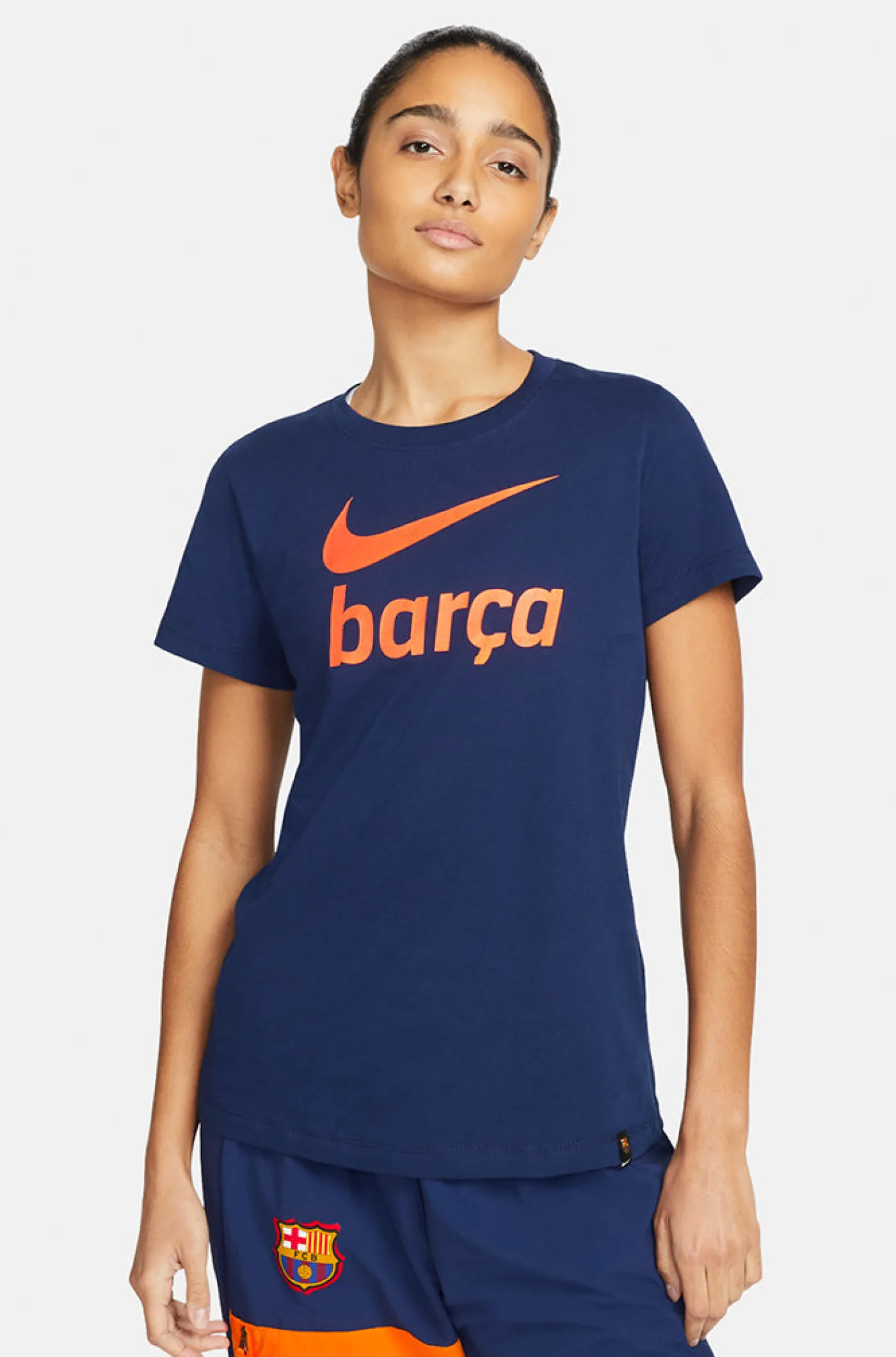 Camiseta para mujer con la rotulación de “Barça” y logo de Nike estampados en el pecho a contraste. Su tejido de algodón la hace una prenda cómoda y ligera. Cuello redondo. Manga corta. Color: azul marino y naranja.