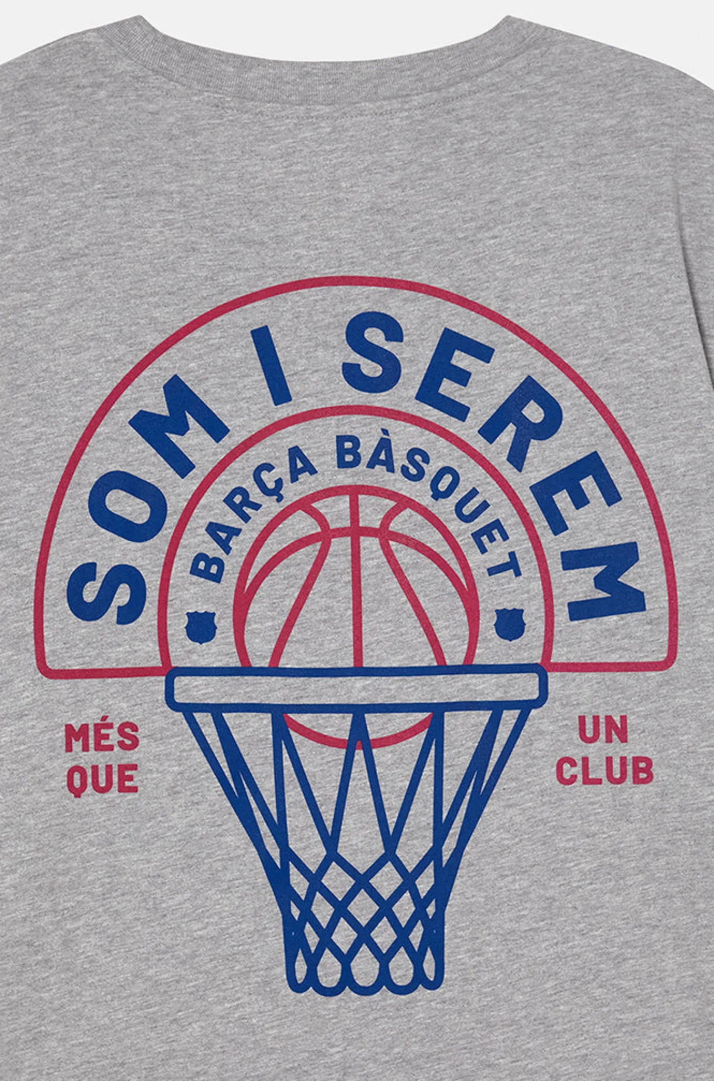 Camiseta de manga corta con el escudo del FC Barcelona en el pecho y rotulación “Barça Baket – Som i Serem». Estampación en la parte trasera con el diseño de la canasta de baloncesto. Cuello redondo. Color: Gris jaspeado.
