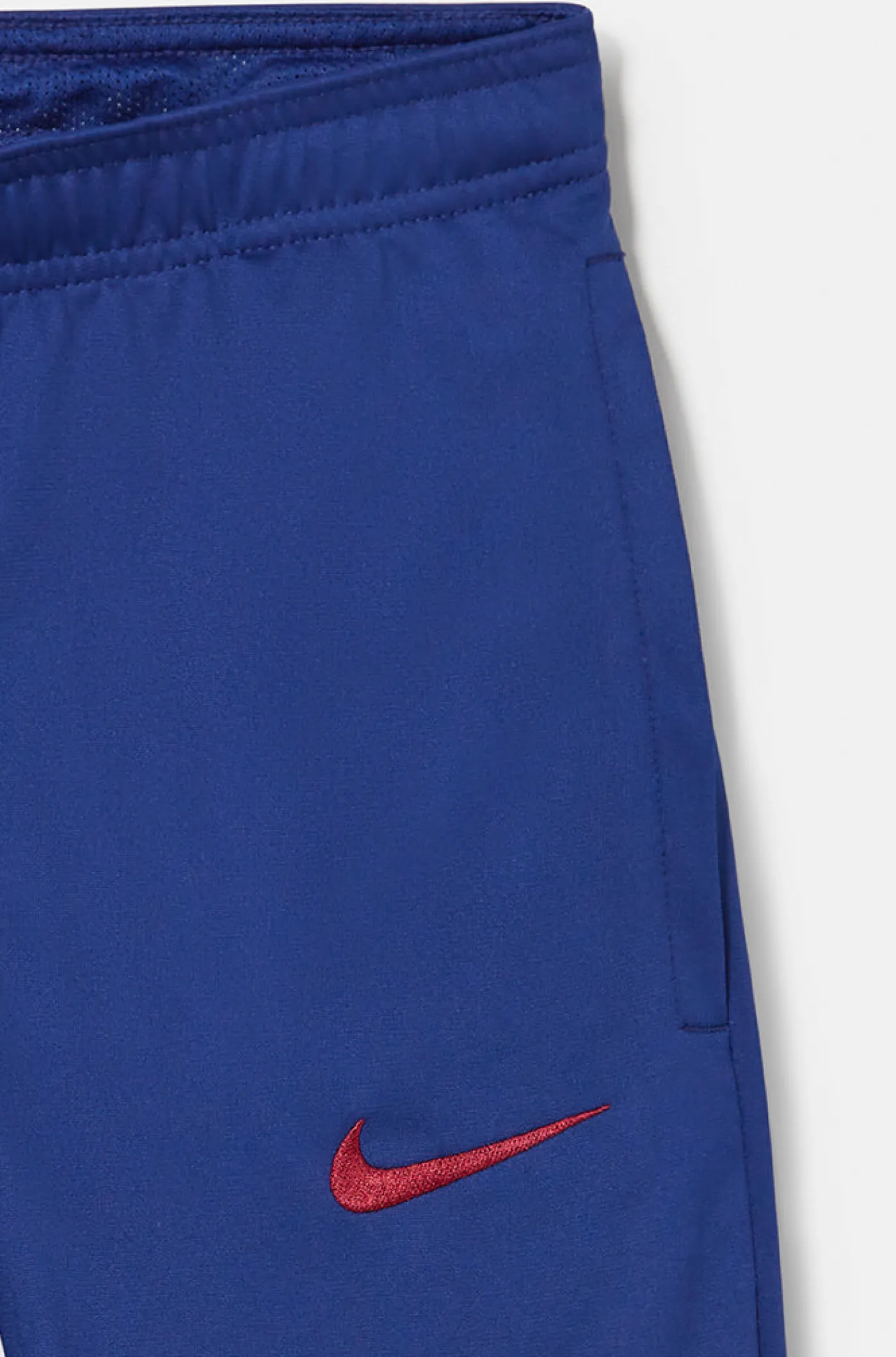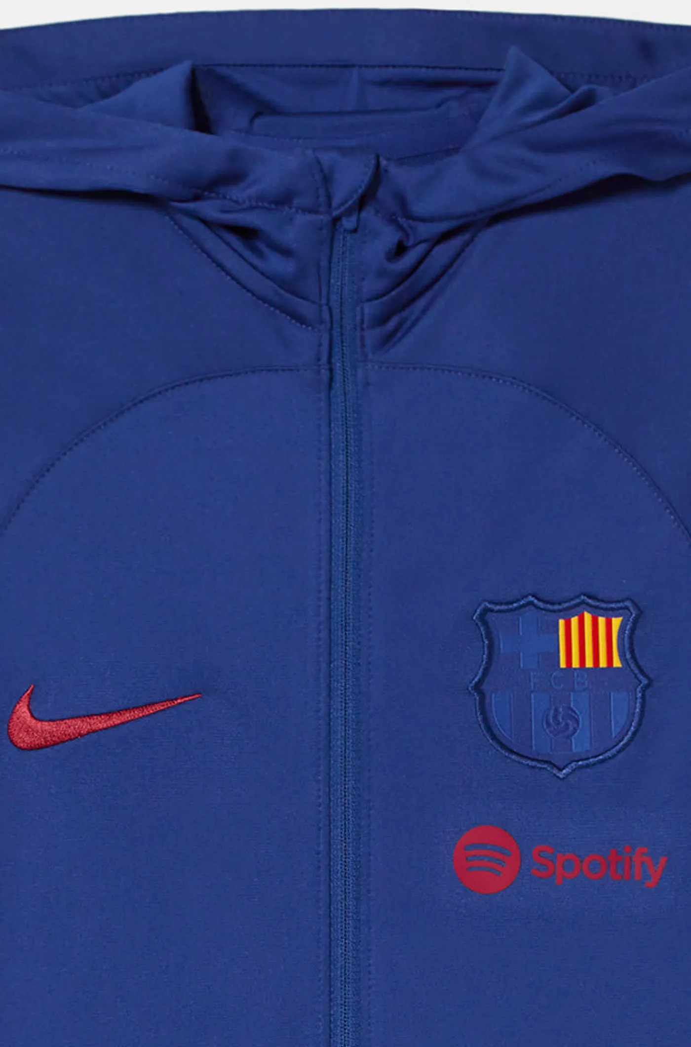 Chándal FC Barcelona de Nike para niños/as de 6 a 14 años. Tecnología DRI-FIT de Nike. Chaqueta con cuello alto y manga larga. Cierre con cremallera. Puños elásticos. Cintura elástica y cordón. Color: azul marino.