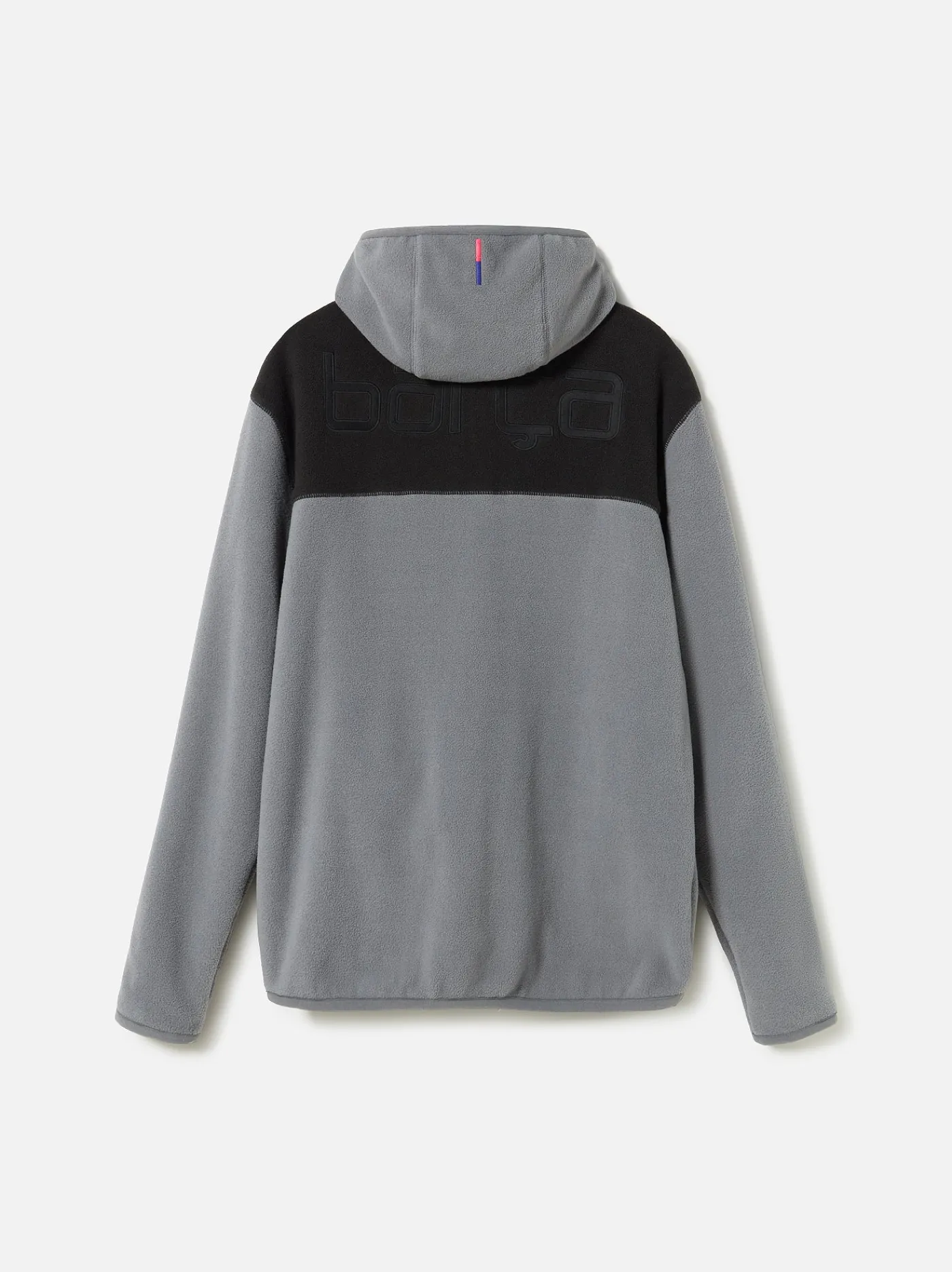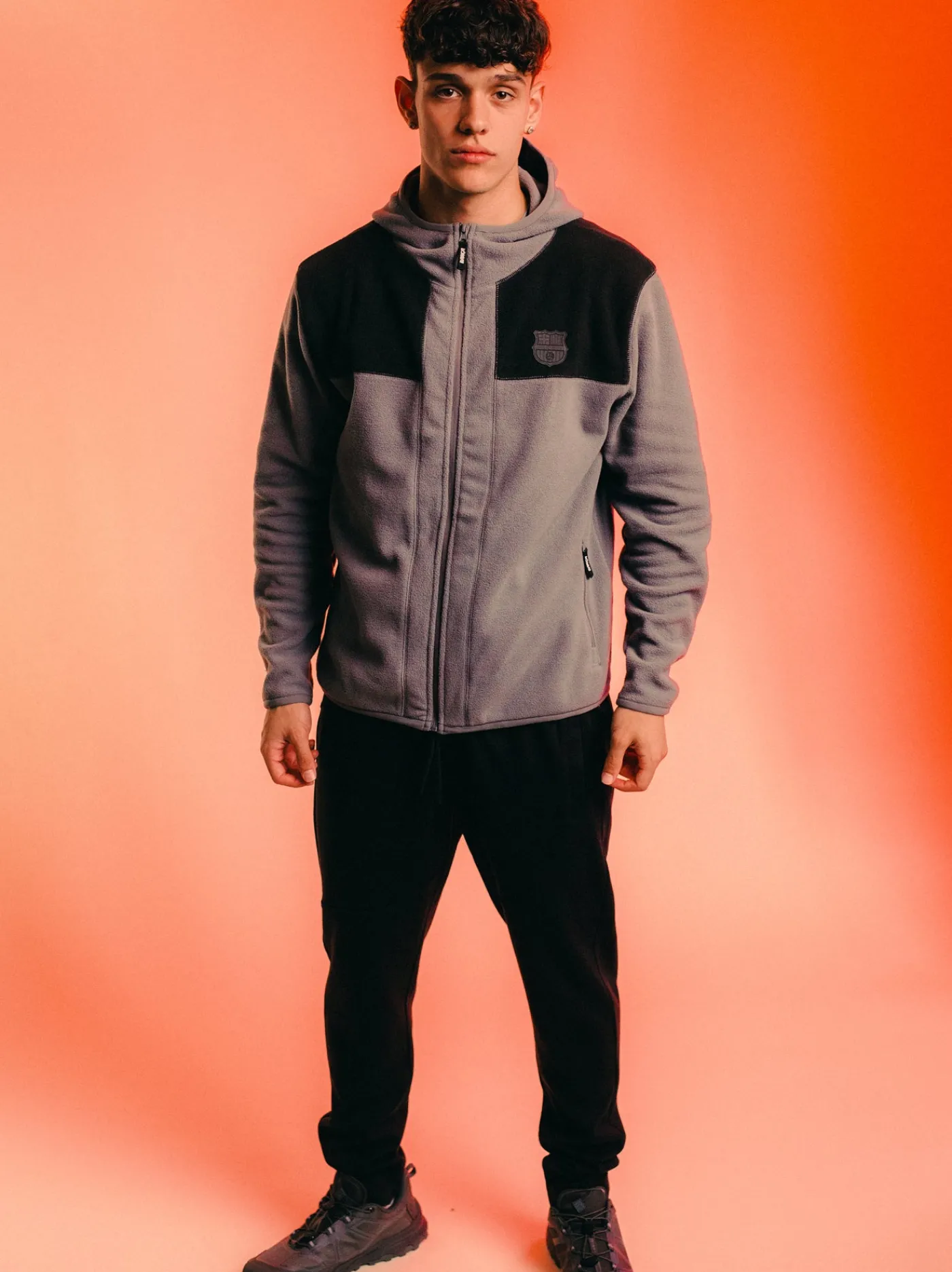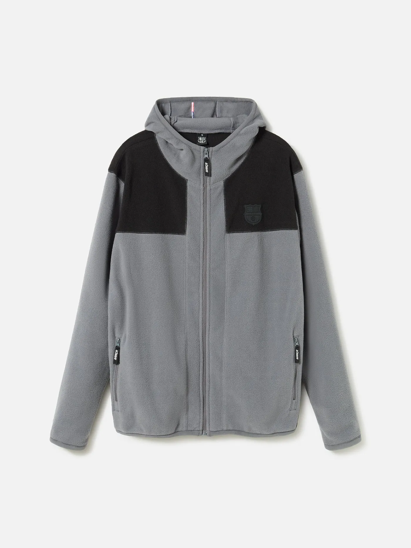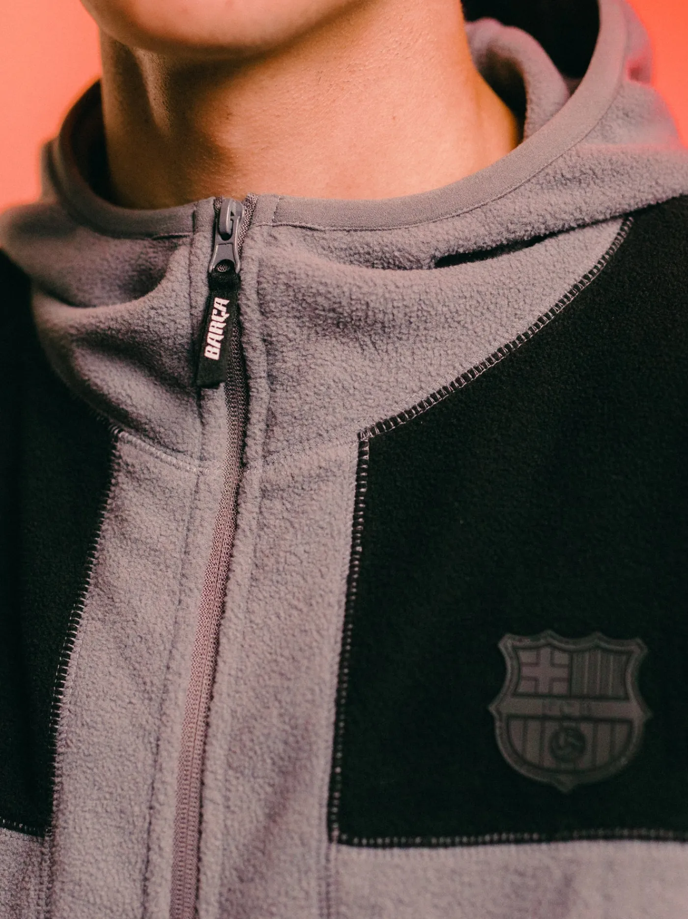 Chaqueta polar gris con el escudo bordado en el pecho, texto «BARÇA» y pequeño detalle blaugrana en la parte trasera.
