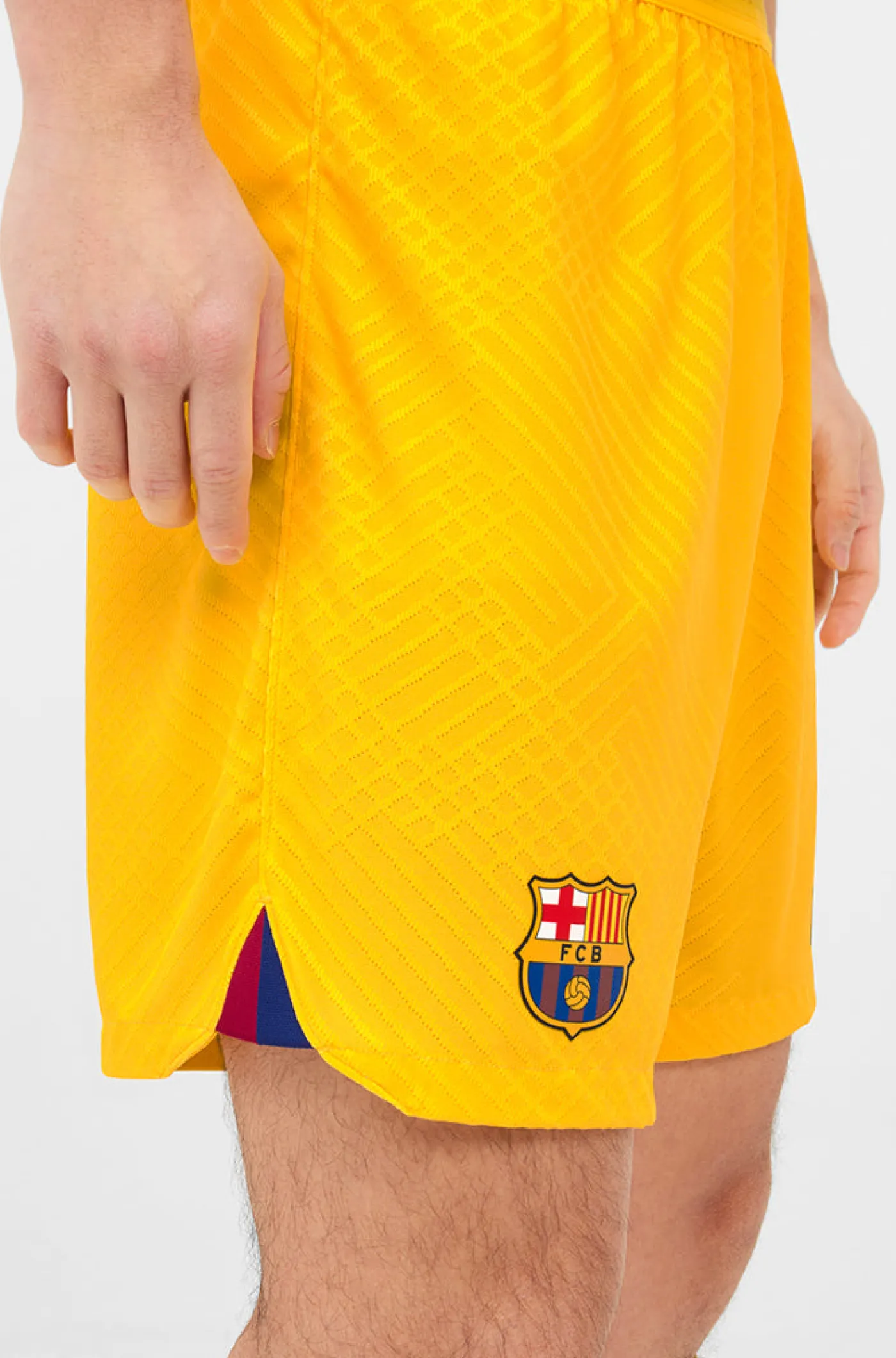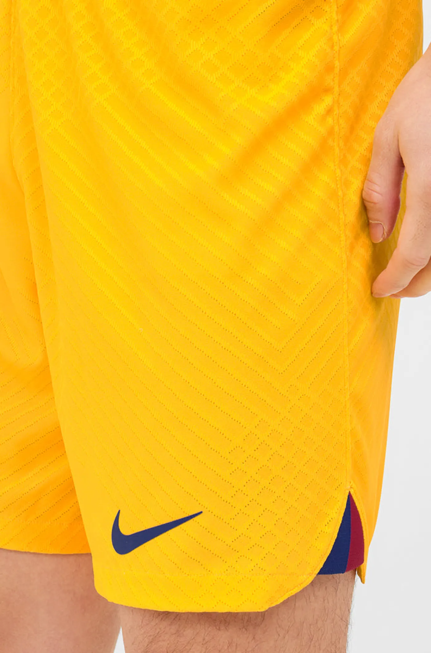 Pantalón corto de la cuarta equipacion del FC Barcelona 22/23. Edición jugador, mismo que llevan los jugadores del primer equipo. Cintura elástica. Su tecnología Nike Dri-FIT ADV cuenta con un tejido de gran elasticidad y secado rápido que evita el roce y combate la humedad. Color: amarillo.