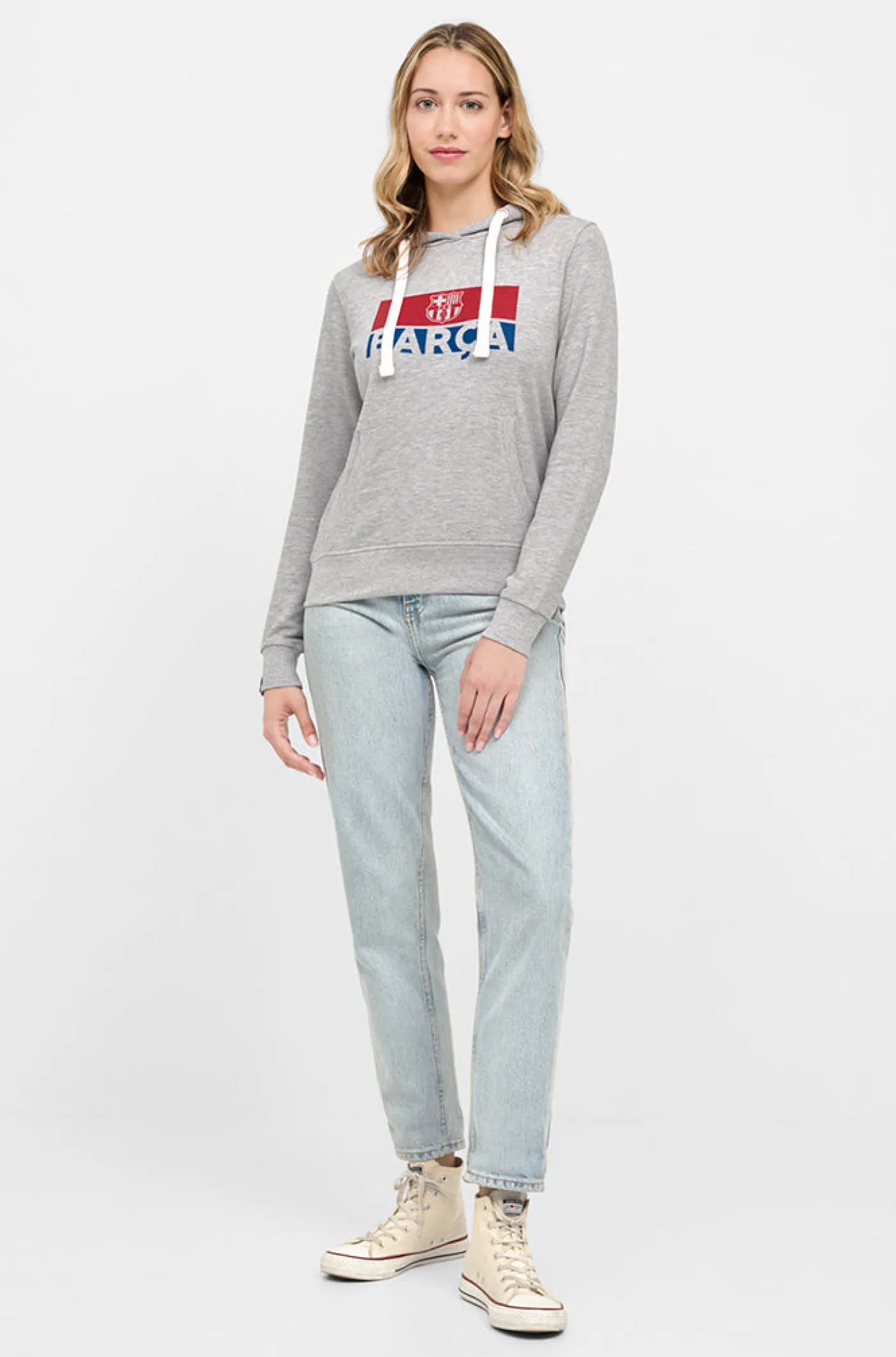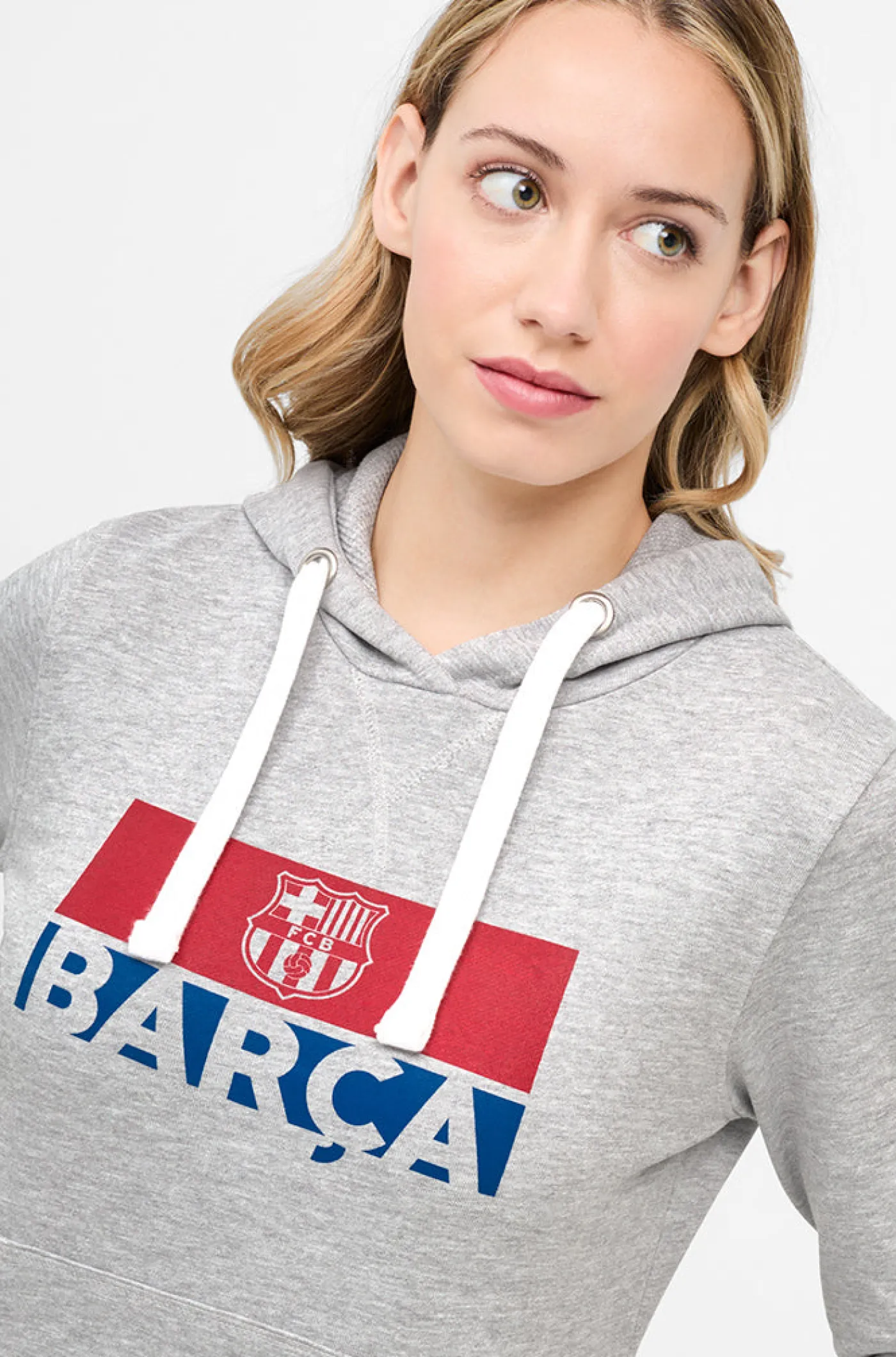 Sudadera de mujer con capucha y bolsillo canguro de algodón. Diseño con estampado del escudo y logo del FC Barcelona. Manga larga. Cintura y puños elásticos. Color: Gris jaspeado