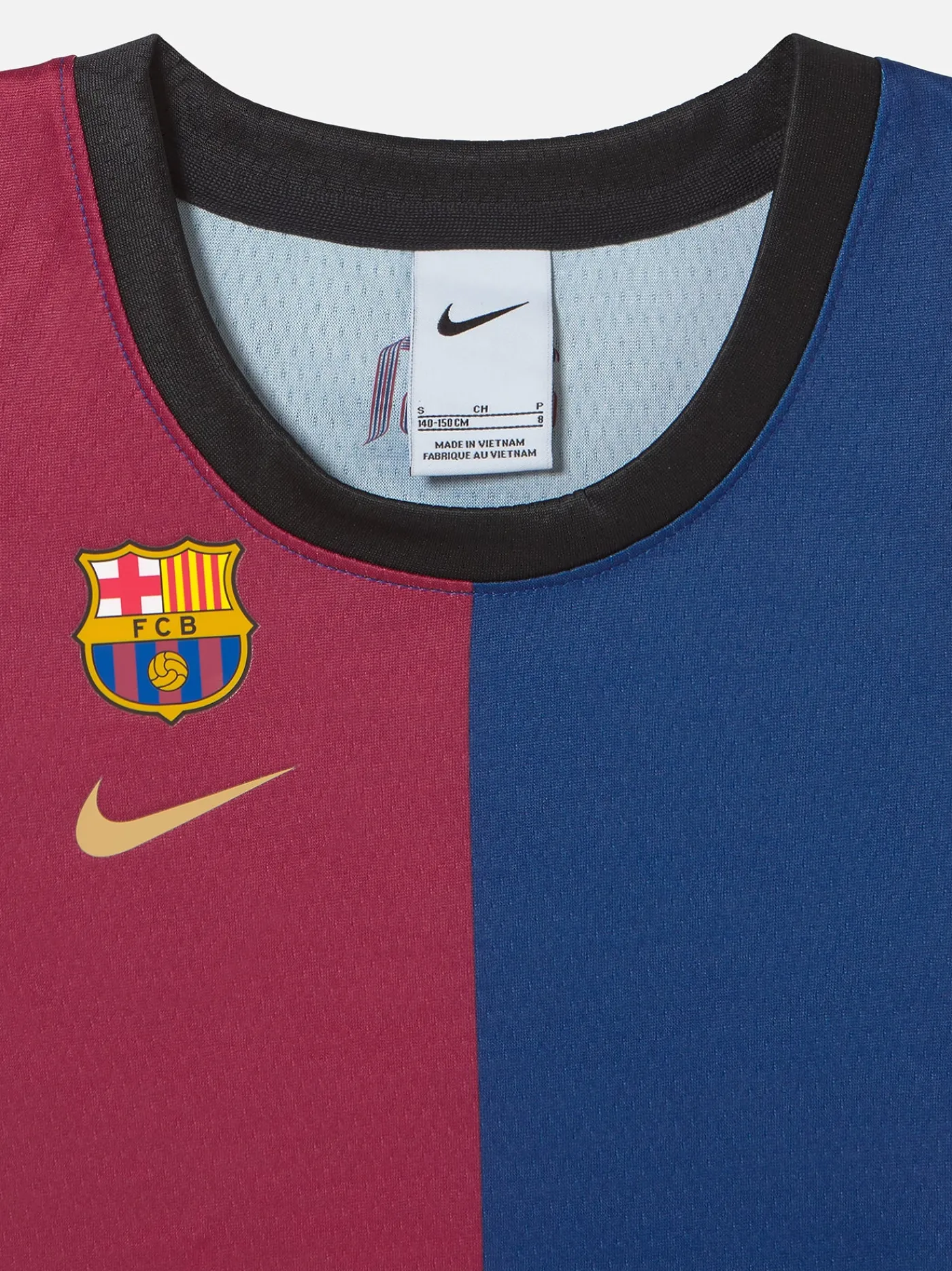 Camiseta de baloncesto para niño de la primera equipación 24/25. Diseño de rayas con el escudo del FC Barcelona y el logo de Nike estampados en el pecho. Cuello redondo en contraste. Tanto las mangas como el escote están rematados con ribete elástico de canalé. La bandera de la senyera en la parte trasera de la camiseta, justo debajo del cuello, refuerza la conexión entre el equipo y el espíritu catalán. Color: Blaugrana.