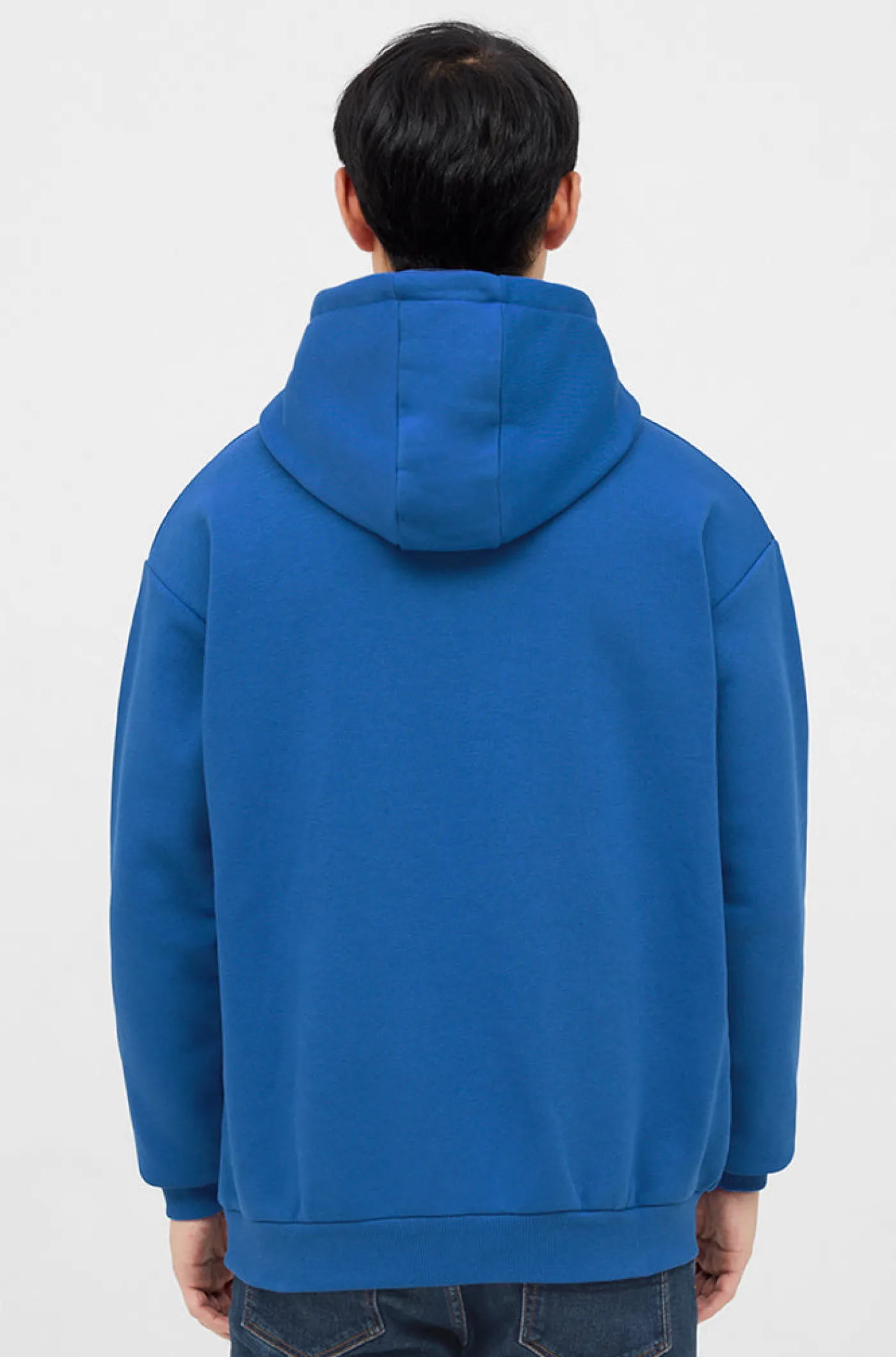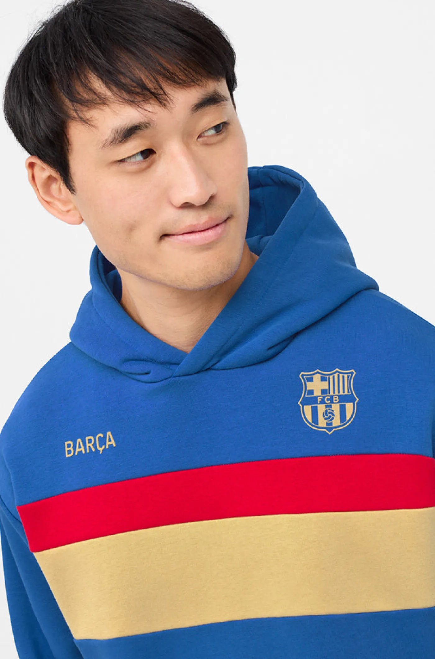 Sudadera con capucha y escudo del FC Barcelona. Detalle de dos bandas a contraste en el pecho. Interior de felpa ligera. Manga larga. Cintura y puños elásticos. Bolsillo canguro. Color: Azul, dorado y rojo