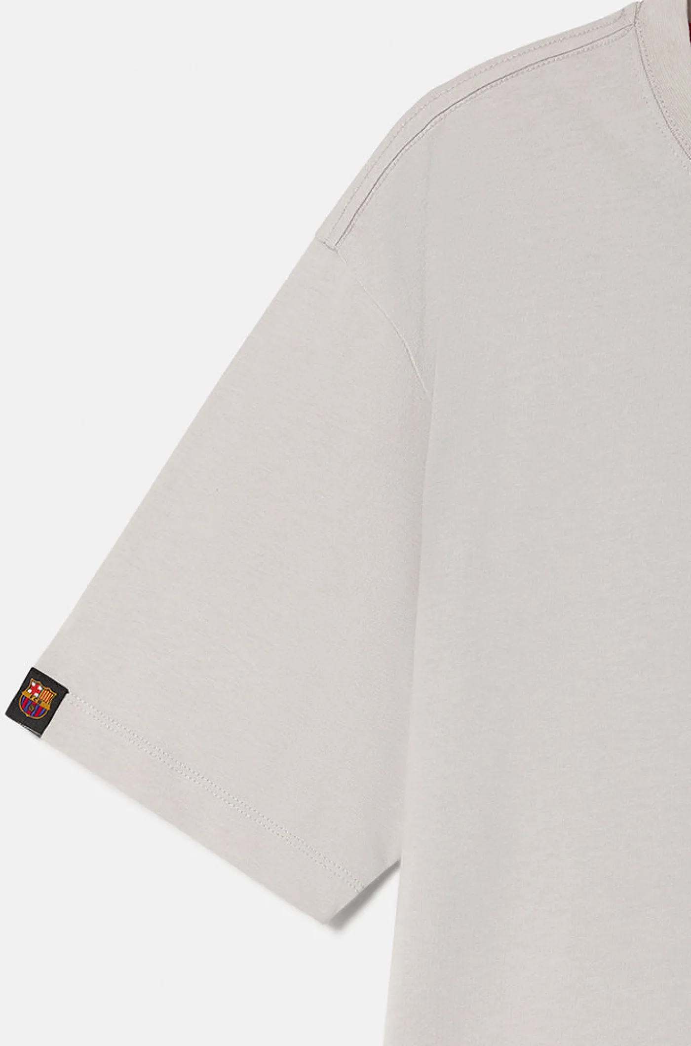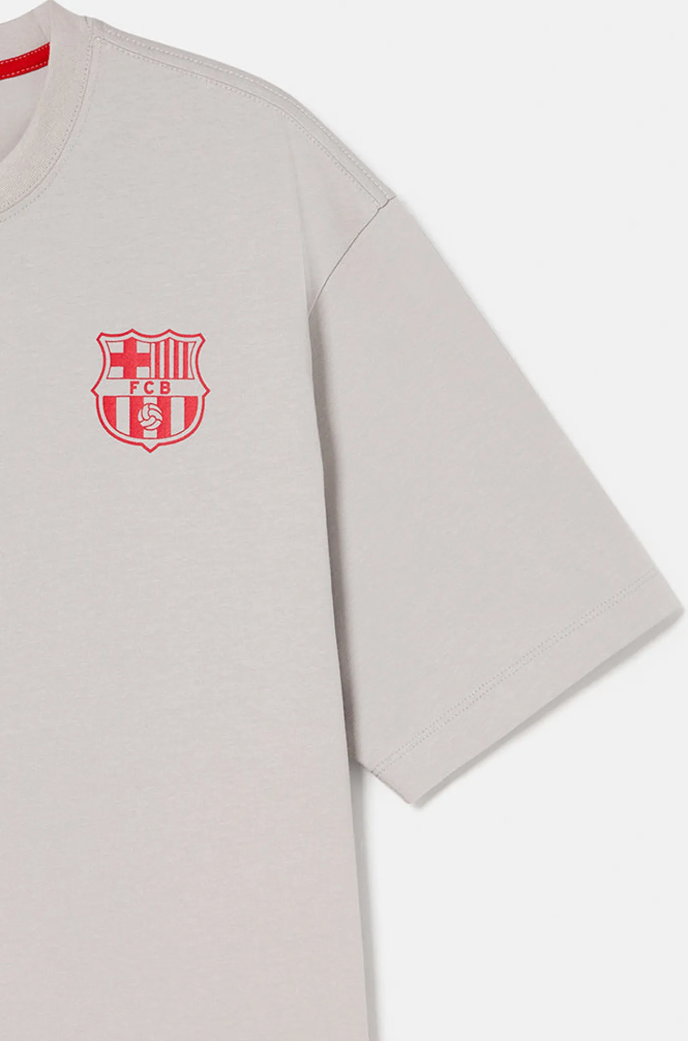 Camiseta de algodón de manga corta con el escudo del FC Barcelona en la parte delantera, el texto «Incondicionals» y una pelota de baloncesto en la espalda. Escote redondeado. Color: gris claro.