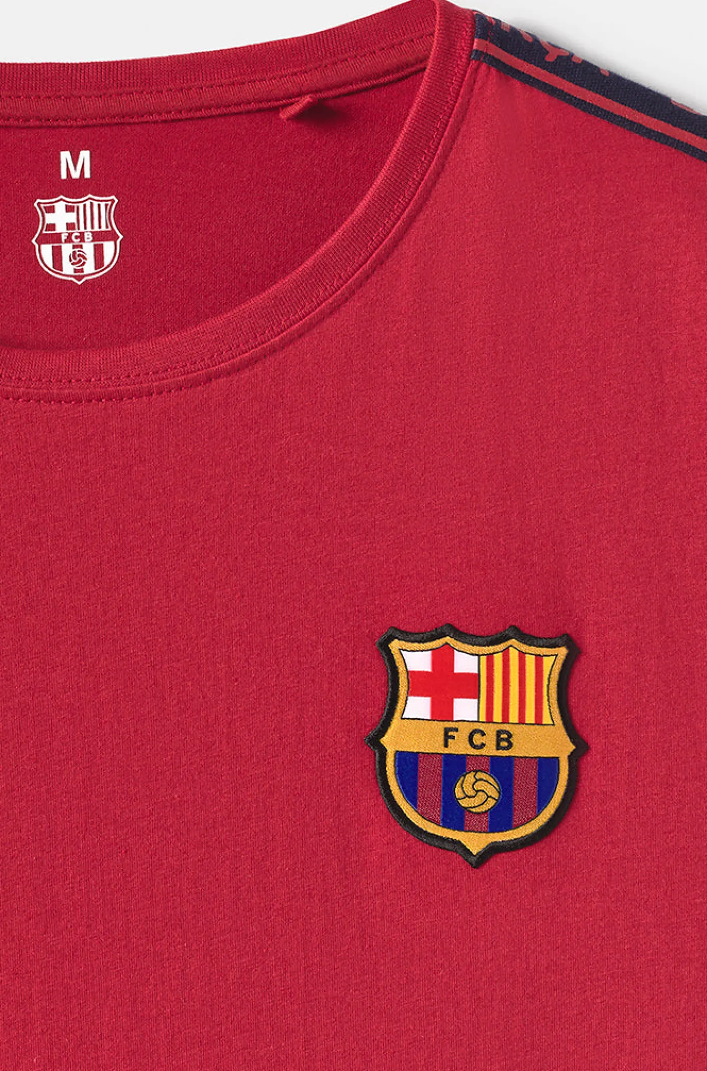 Camiseta de manga corta con parche del escudo del FC Barcelona en el pecho. Detalle de cinta con rotulación de “Barça” estampada en ambas mangas. Cuello redondo. Color: Granate