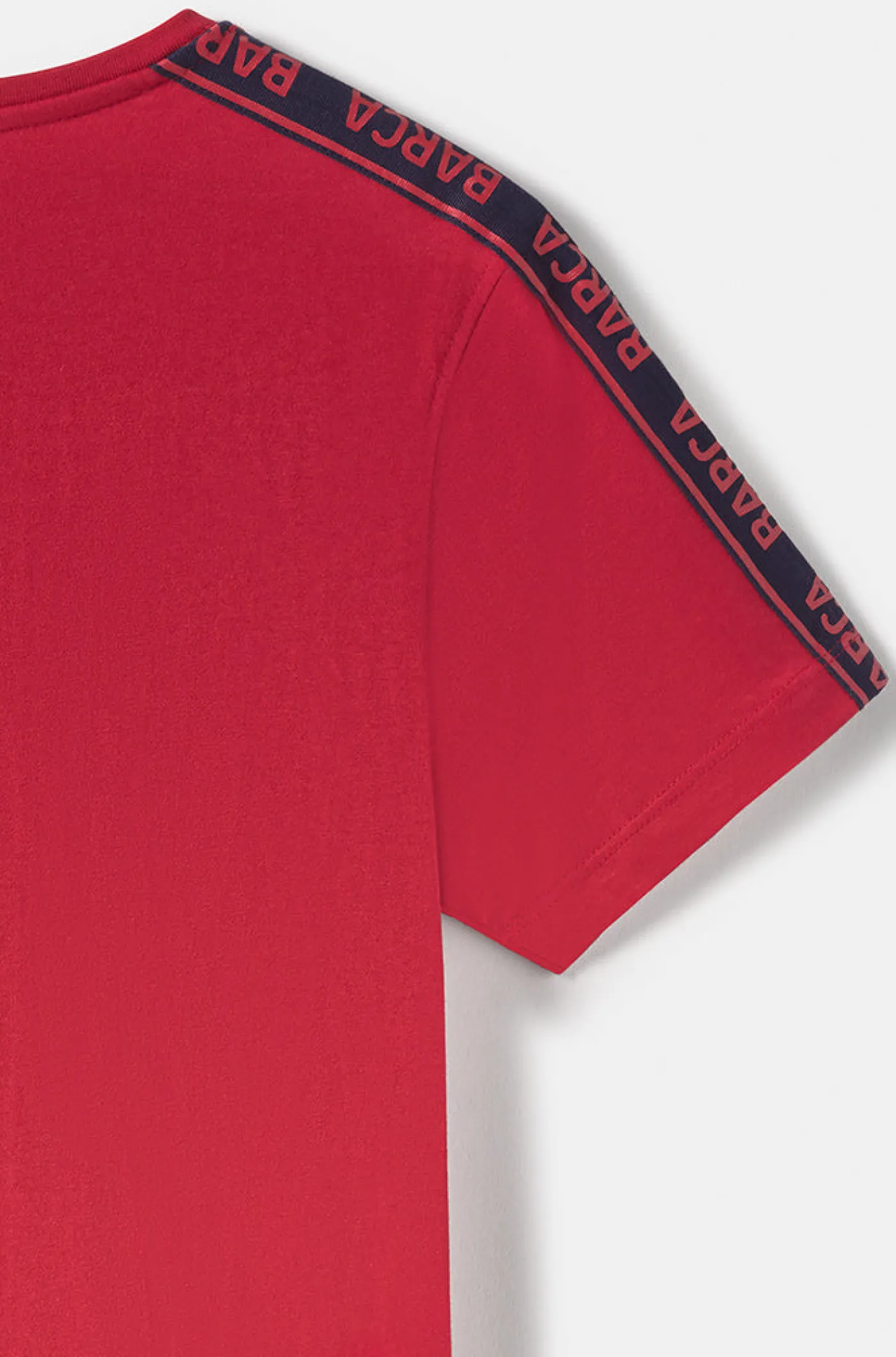 Camiseta de manga corta con parche del escudo del FC Barcelona en el pecho. Detalle de cinta con rotulación de “Barç…