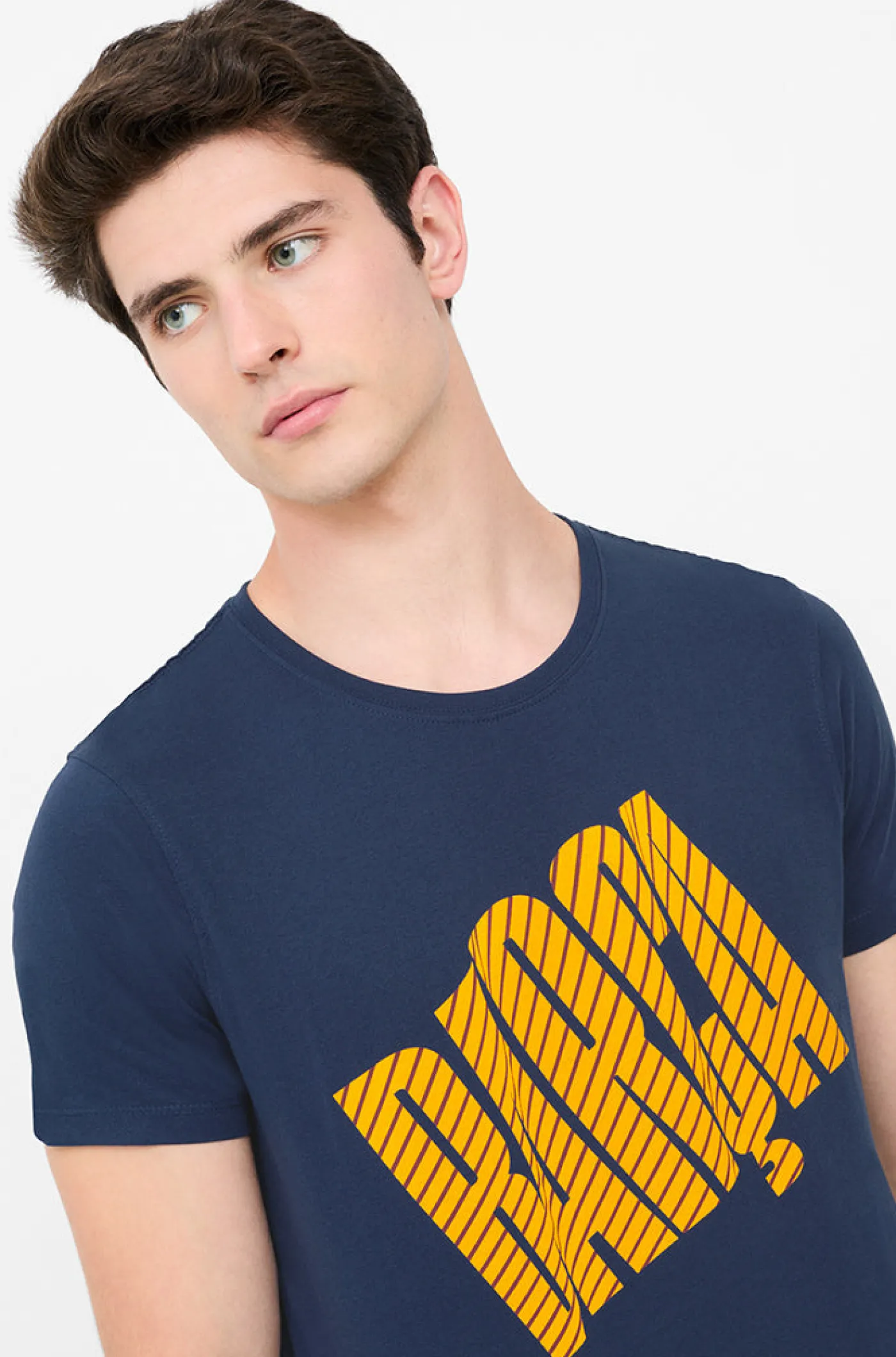 Camiseta con estampación del logo Barça. Detalle de la senyera en la parte posterior del cuello. Cuello redondo y manga corta. Color: Marino y amarillo