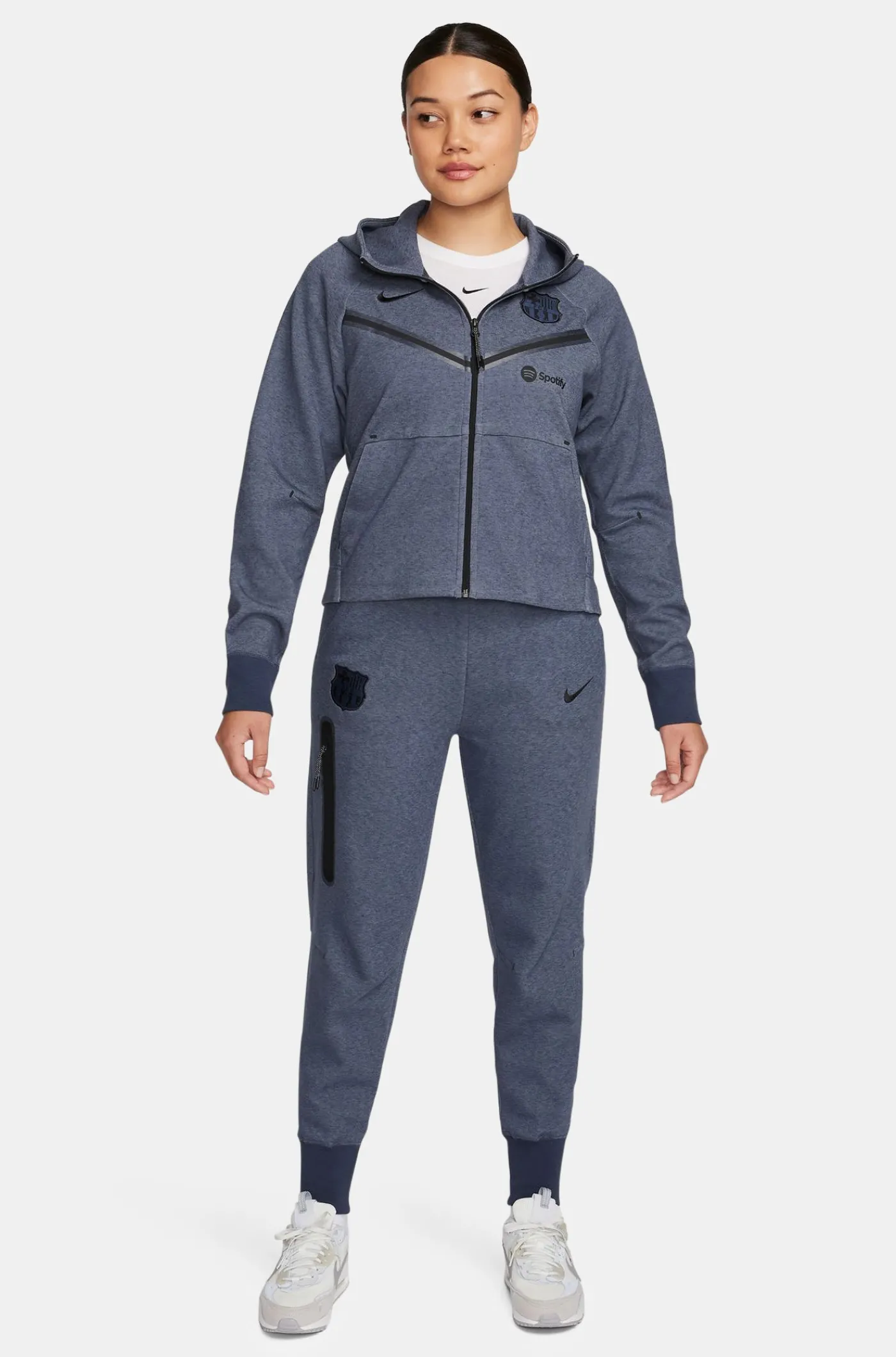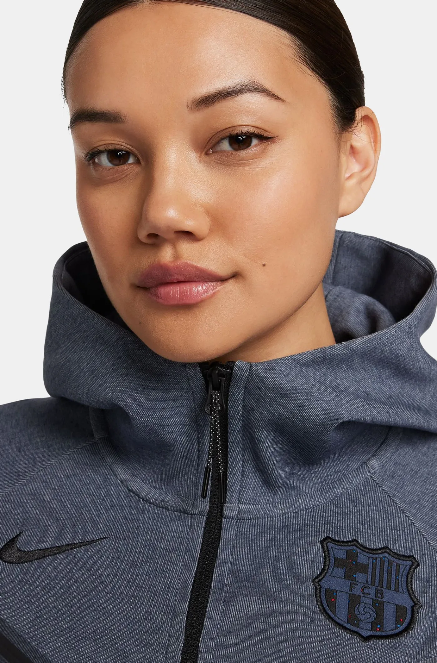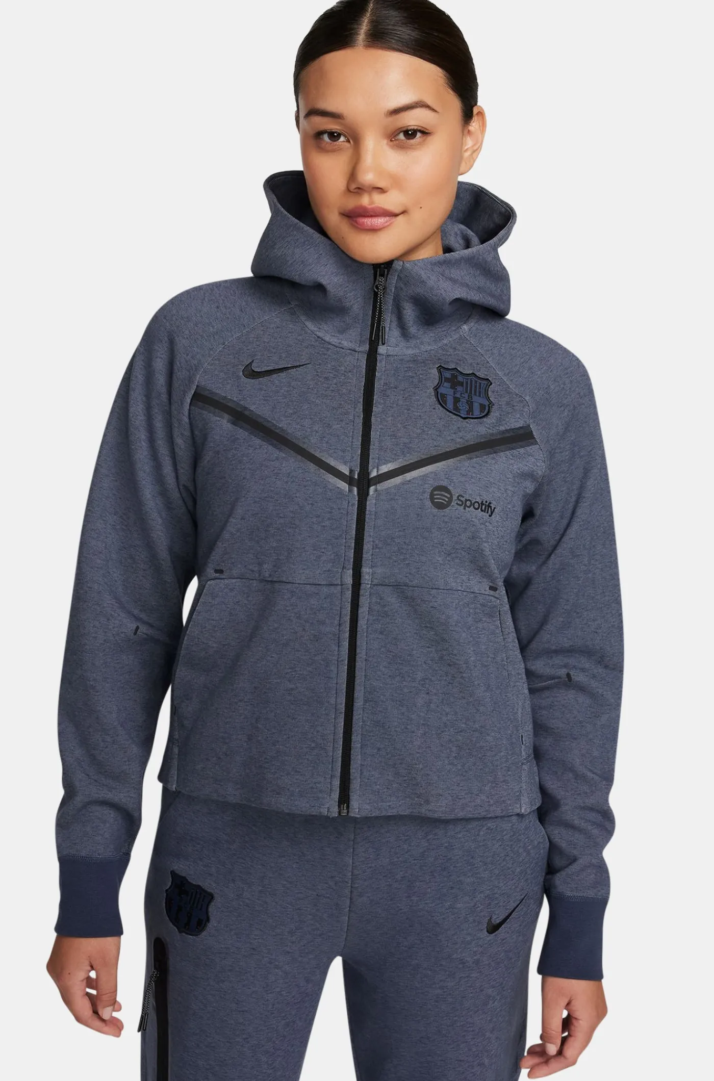 Chaqueta del FC Barcelona 23/24 para mujer. Con el escudo del FC Barcelona y el logo de Nike bordado en el pecho a contraste. Manga larga. Capucha y cierre con cremallera. Dos bolsillos abiertos en la parte delantera y otro en la manga con cremallera. Color: azul y negro.