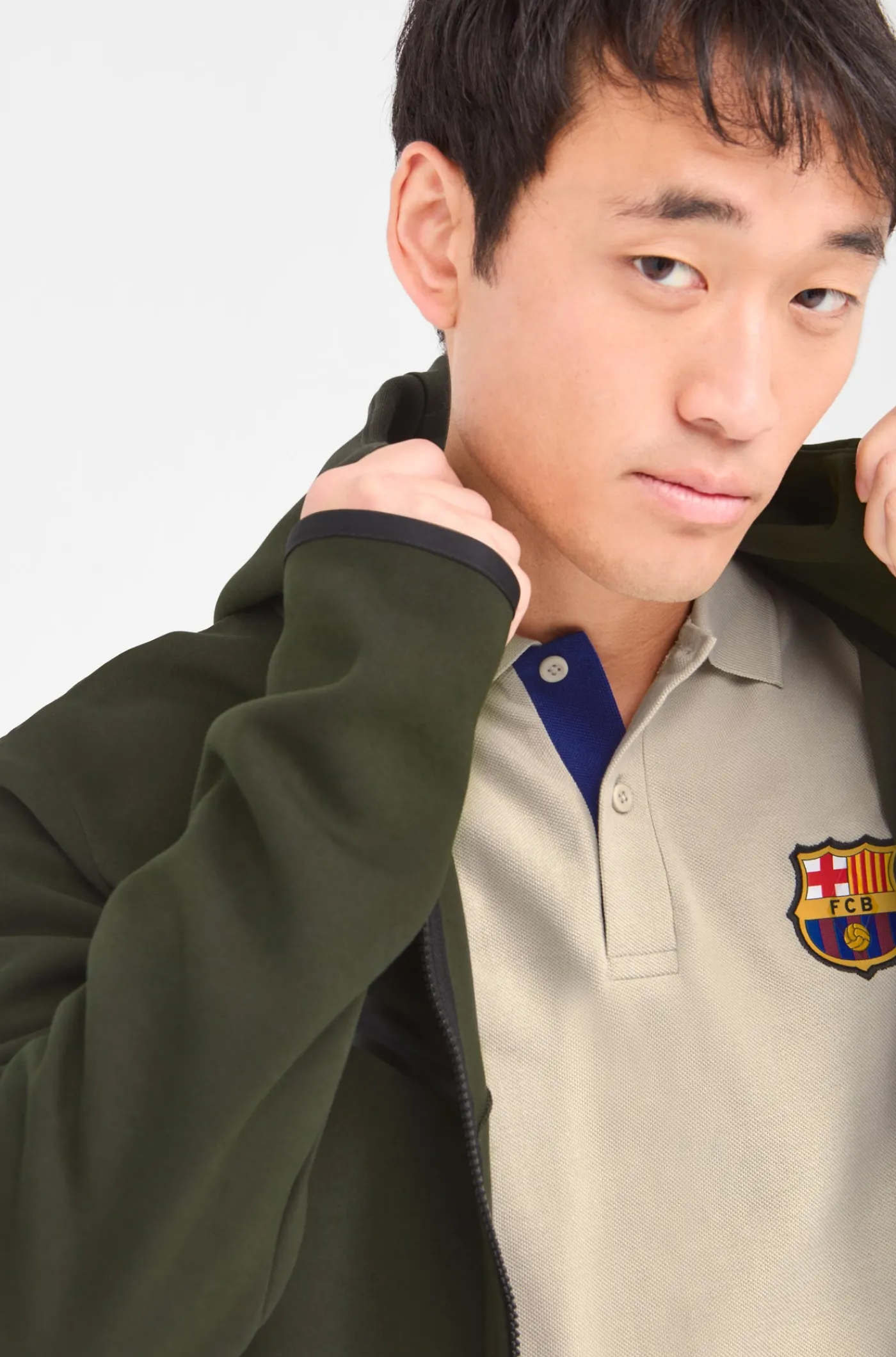 Polo de manga corta con escudo en relieve del FC Barcelona y el logo bordado de Nike. Corte asimétrico. Cuello con solapas. Cierre con 2 botones en el pecho. Aberturas en los laterales. Su tejido de algodón la convierte en una prenda cómoda y ligera. Color: beige.