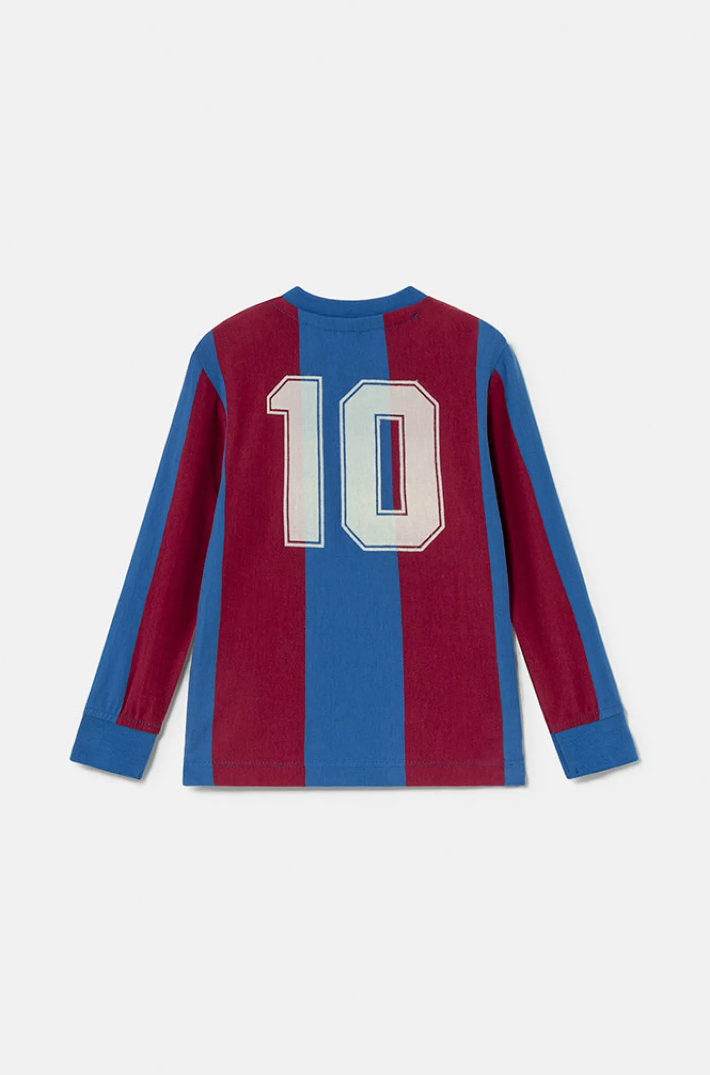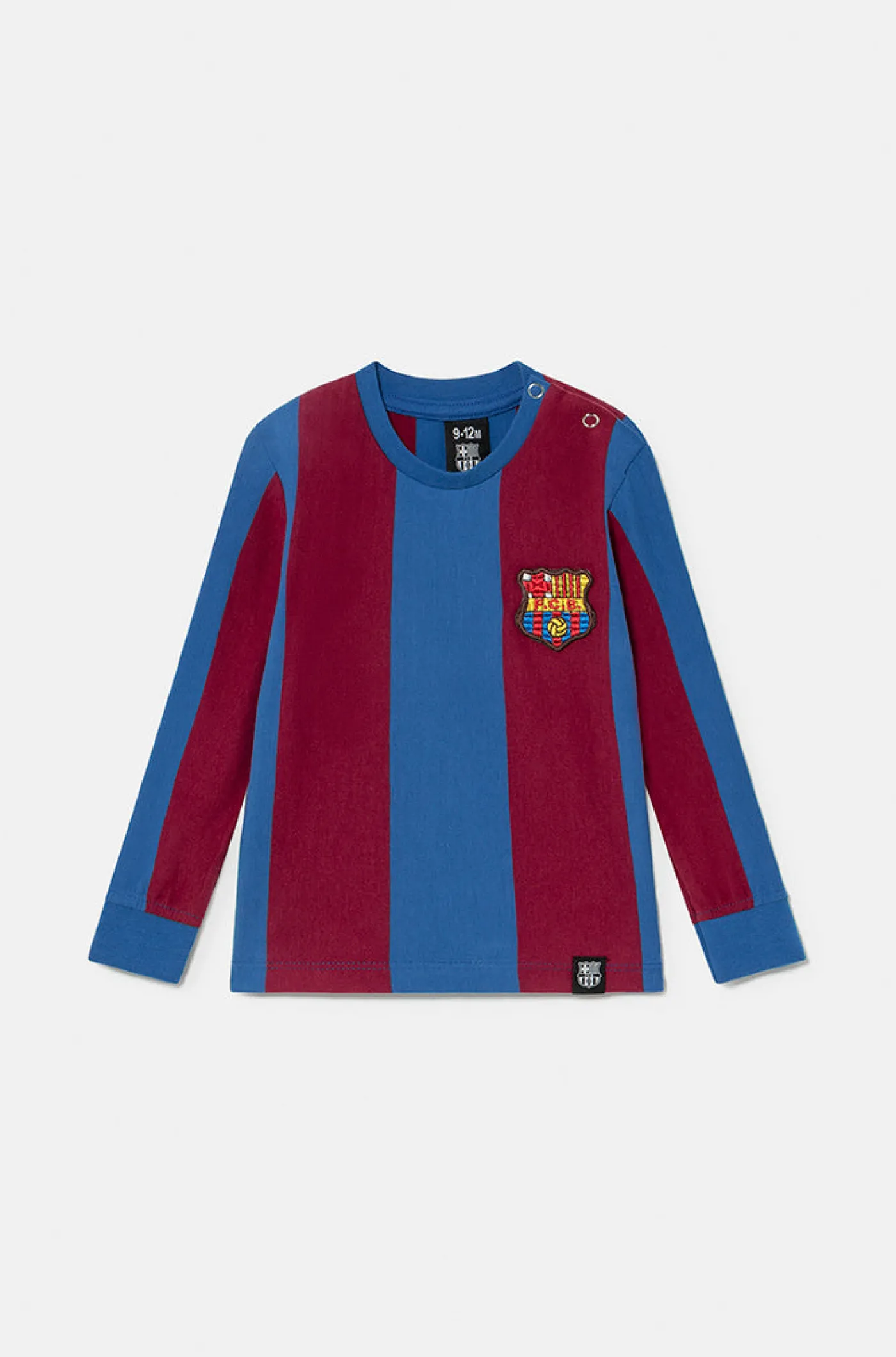Camiseta de bebé vintage de la 1ª Equipación del FC Barcelona 1899. Realizada en algodón orgánico. Cuello redondo. Manga larga. Cierre con botones a presión en el hombro. Color: Azulgrana. Venta exclusiva de Barça Stores,