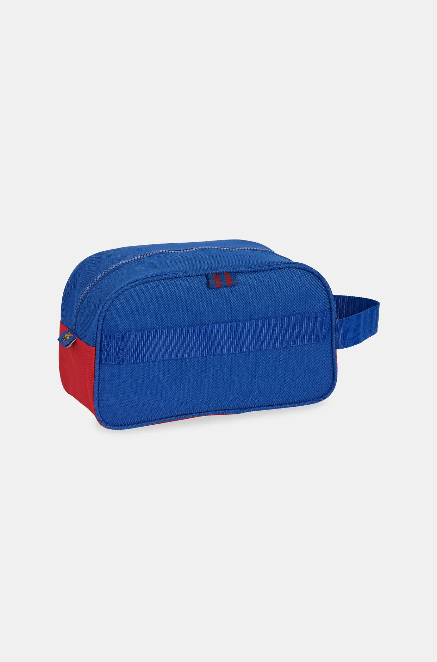 Neceser con estampado de la segunda equipación del FC Barcelona y escudo en relieve en el centro. Detalle de lettering con la palabra «Barça» y senyera en la parte trasera. Adaptable a mochila con carro o carro. Dos compartimentos con cremallera. Asa en el lateral. Color: Blaugrana.