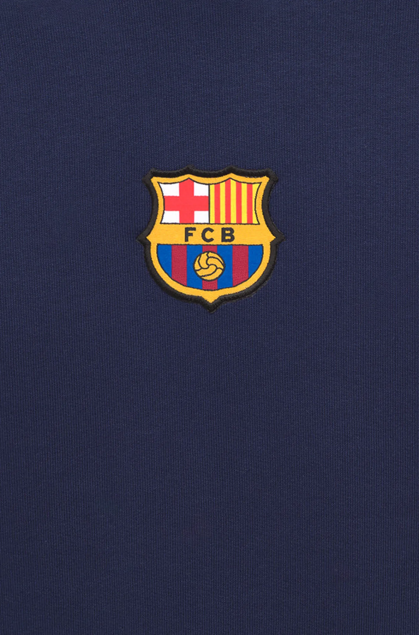 Sudadera con capucha y con el parche del escudo del FC Barcelona centrado en el pecho. Interior de felpa ligera. Cuello alto con cordones ajustables. Manga larga con bandas decoradas con las figuras del escudo del FC Barcelona. Cintura y puños elásticos. Bolsillo canguro. Color: Marino.