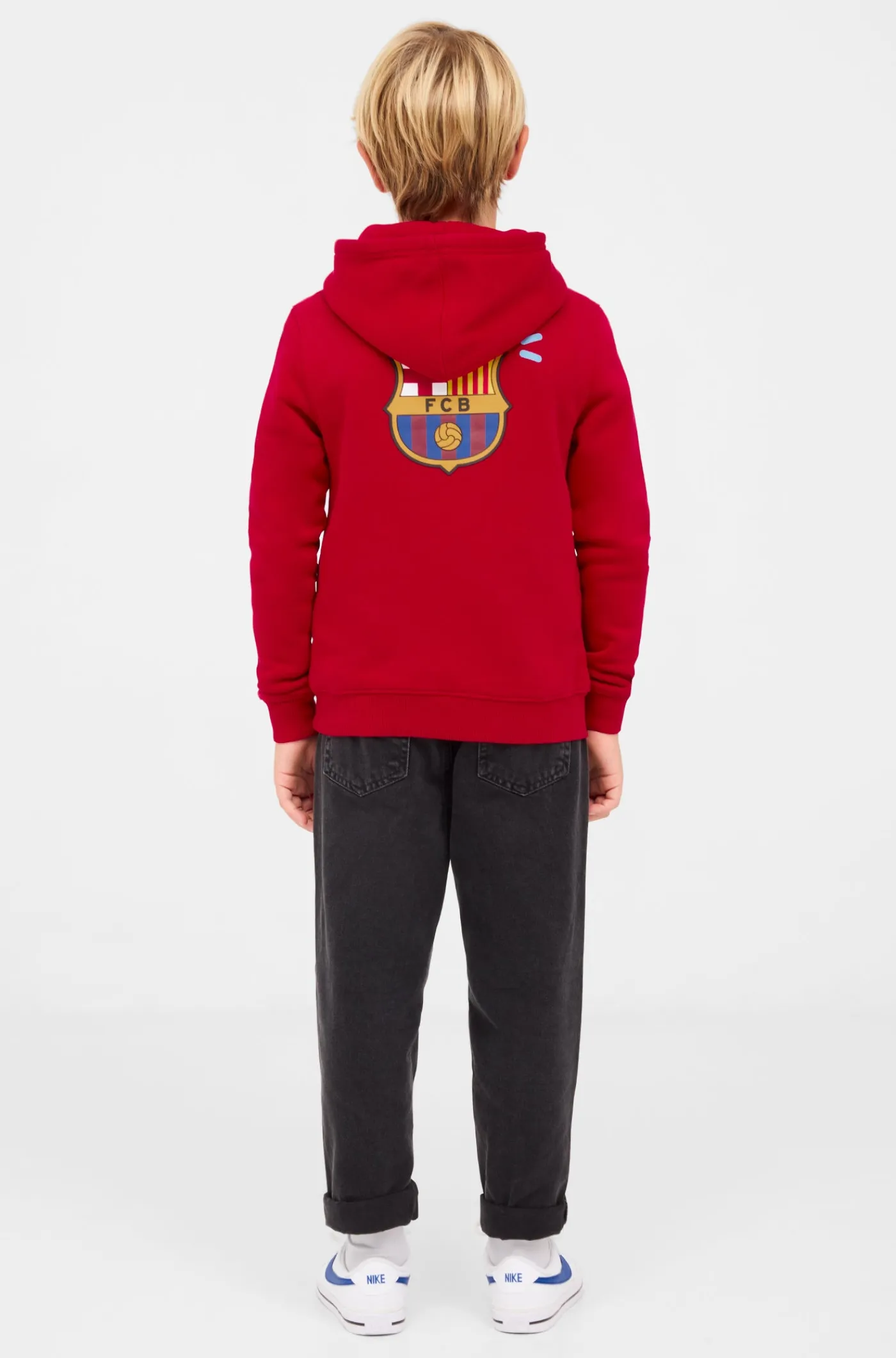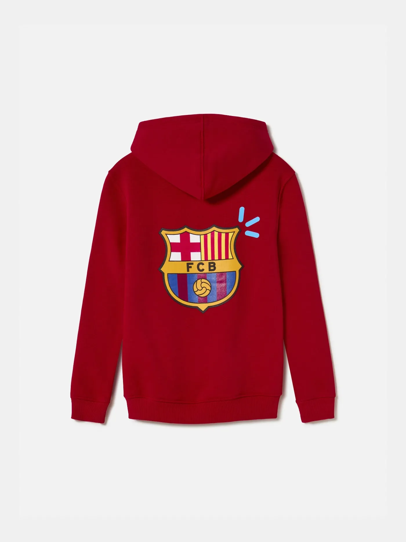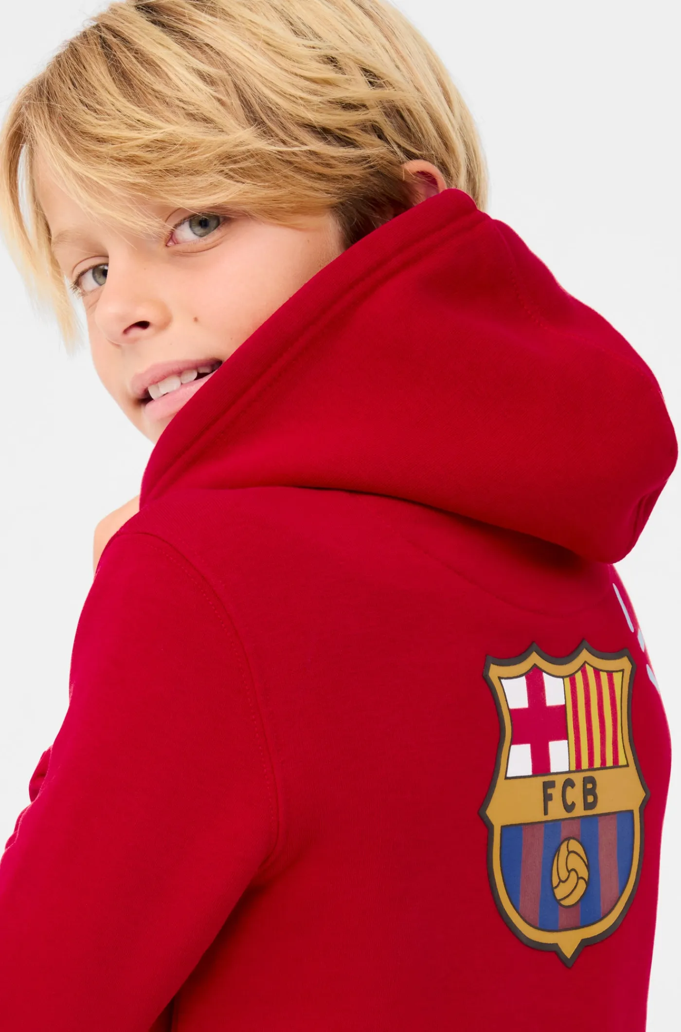 Sudadera con capucha con el escudo del FC Barcelona y la rotulación de “MÉS QUE UN CLUB” en relieve en la parte delantera. Interior de felpa ligera. Cuello alto. Manga larga. Cintura y puños elásticos. Color: rojo.