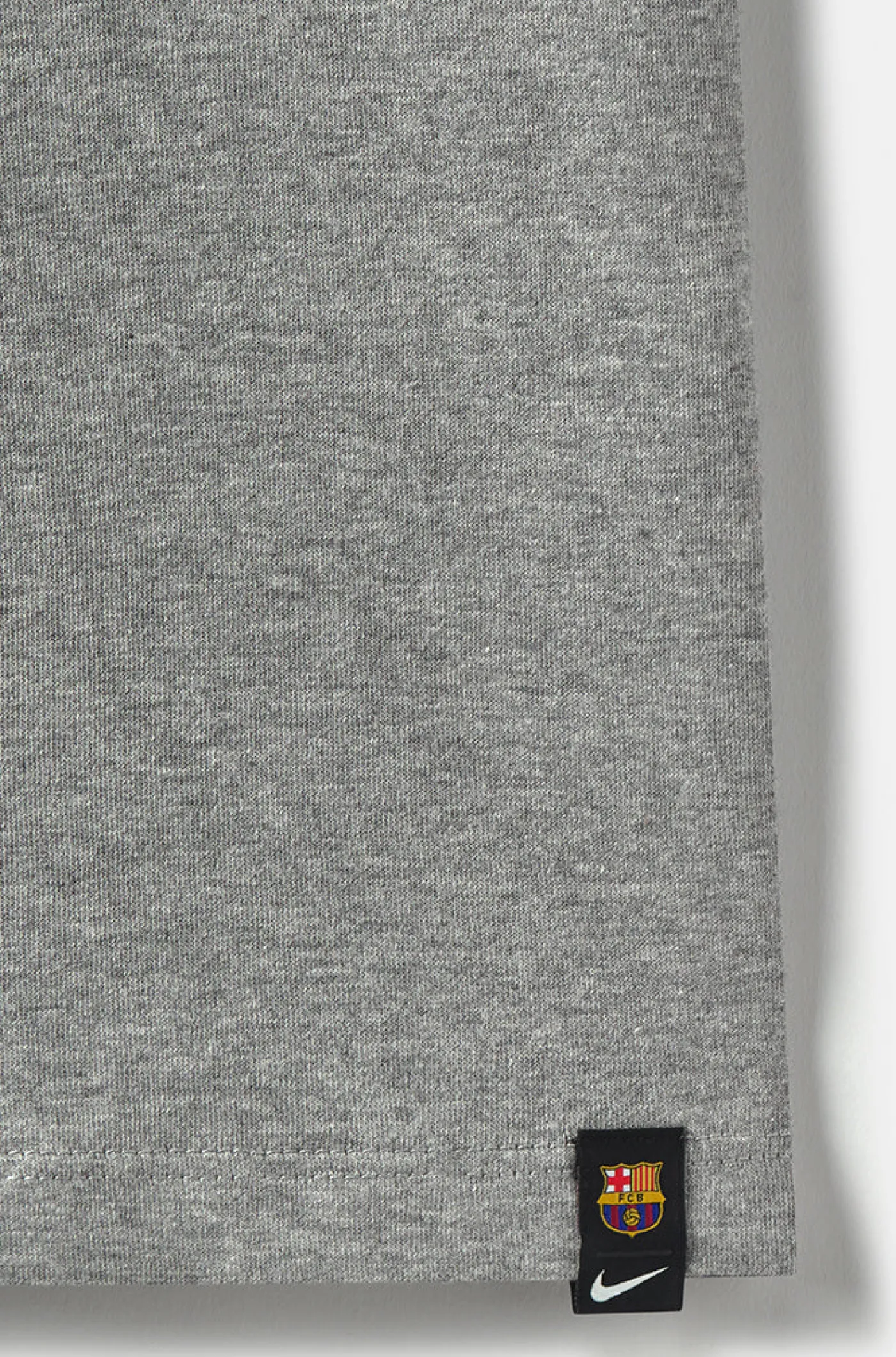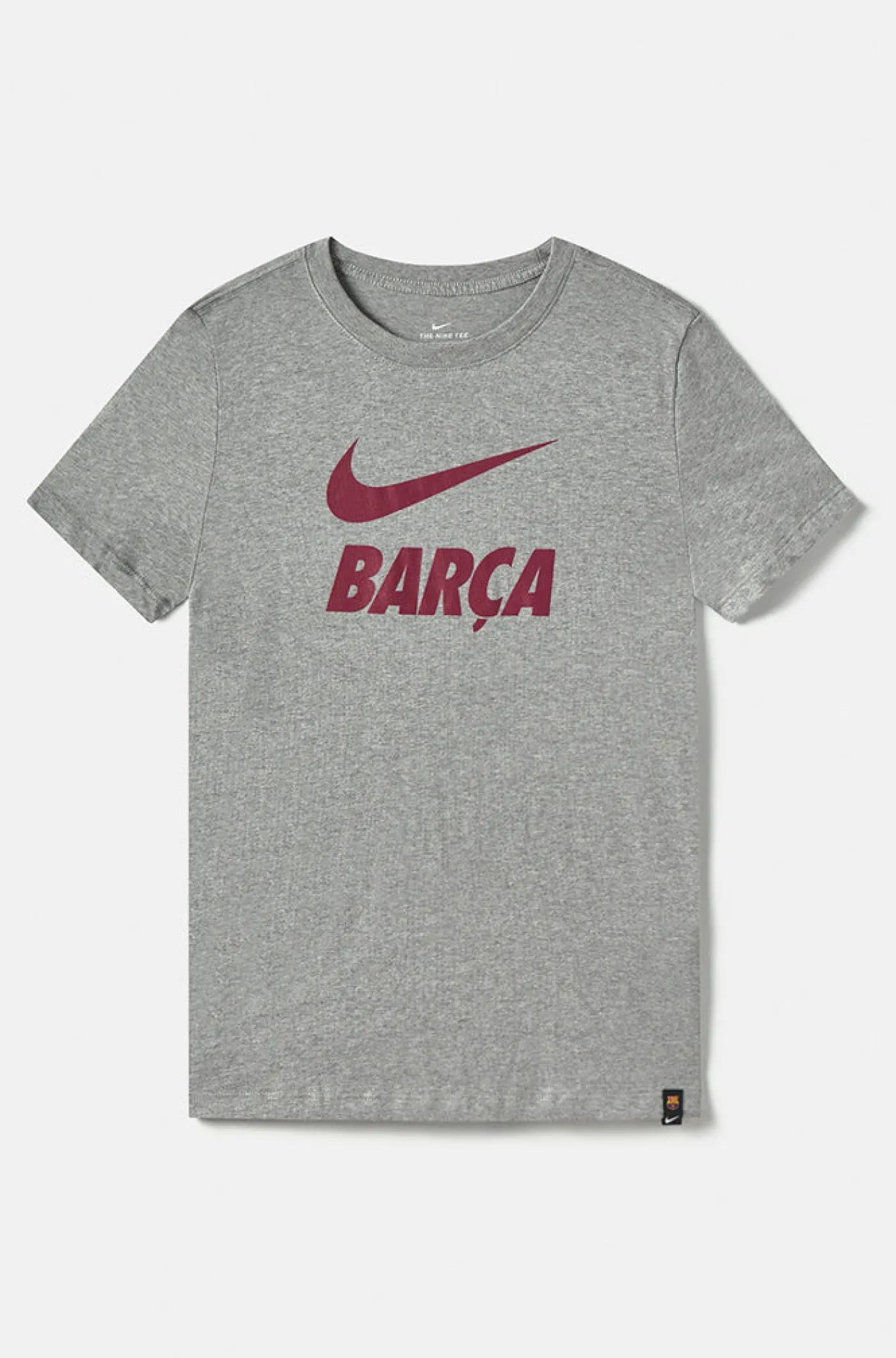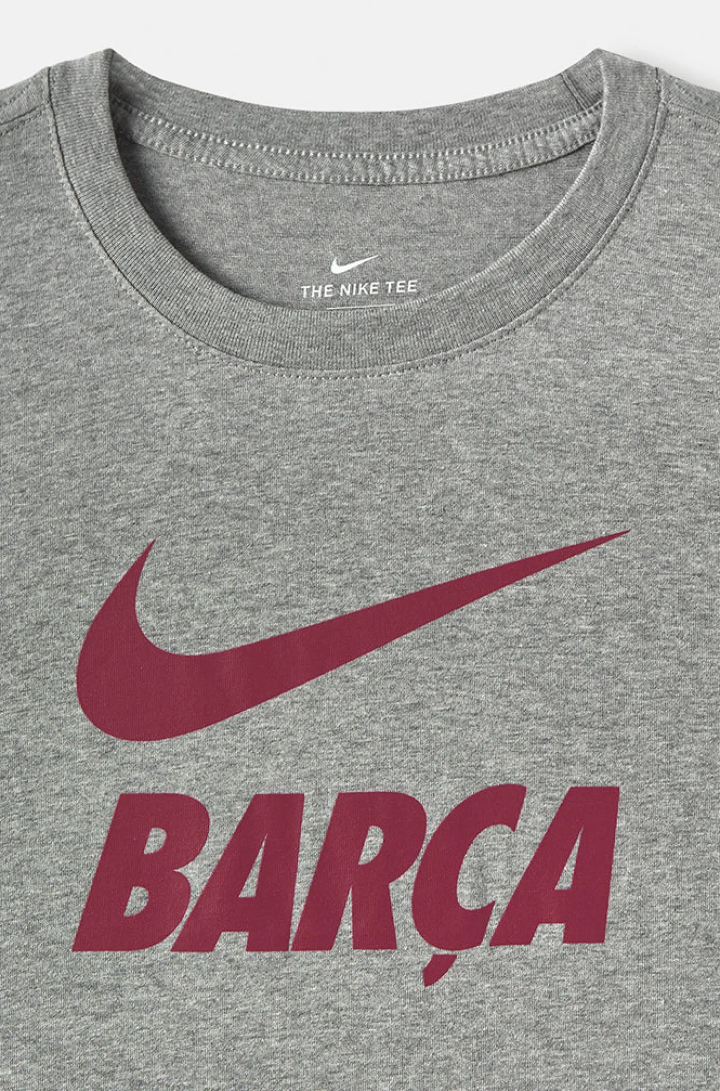 Camiseta para mujer de manga corta con rotulación de “Barça” y logo de Nike a contraste. Detalle de escudo del FC Barcelona en la parte inferior de la cintura. Regular Fit. Cuello redondo. Su tejido de algodón la hace una prenda cómoda y ligera. Color: Gris jaspeado